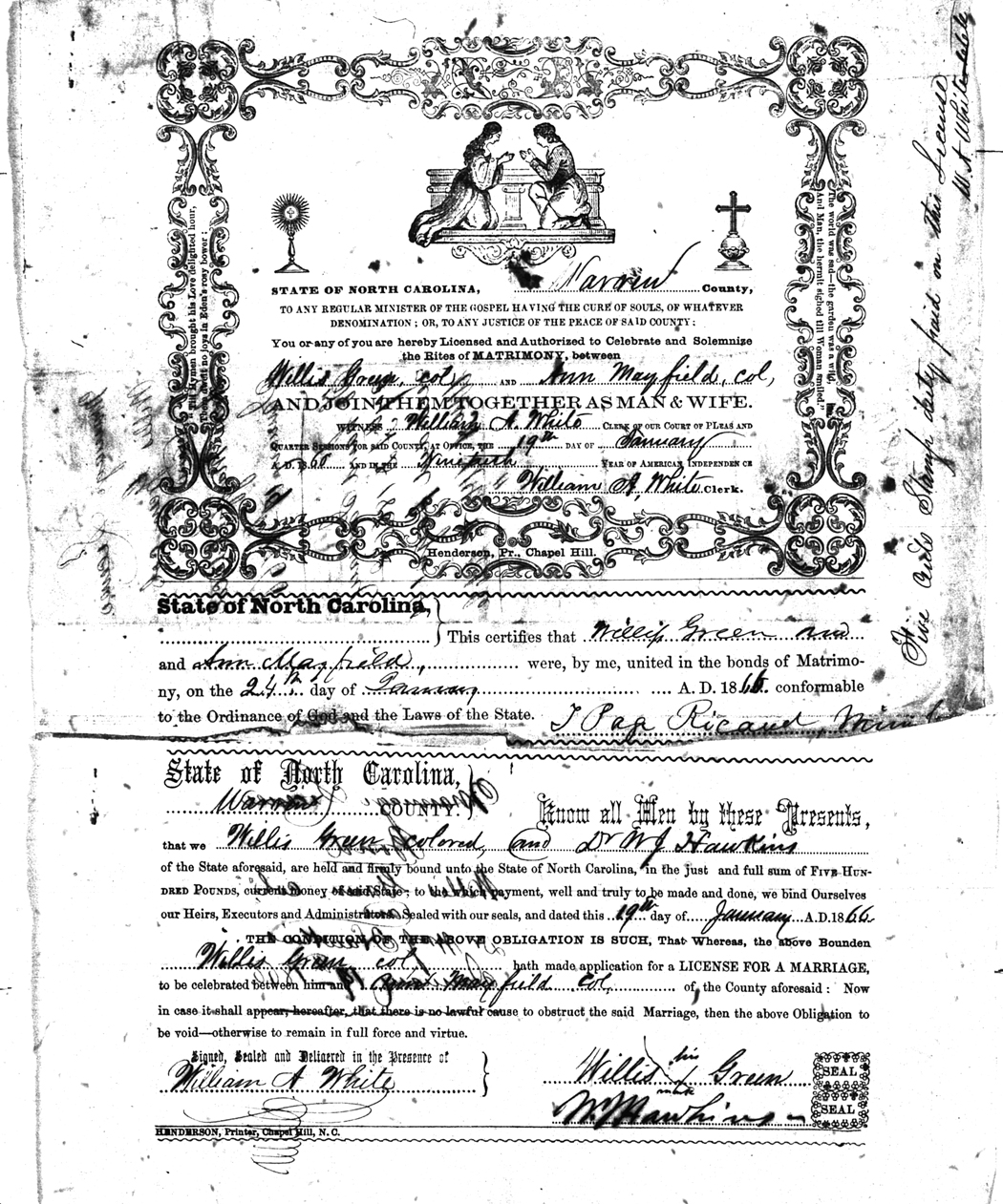 Green Willis Mayfield Ann 19 Jan 1866   W. Hawkins Colored