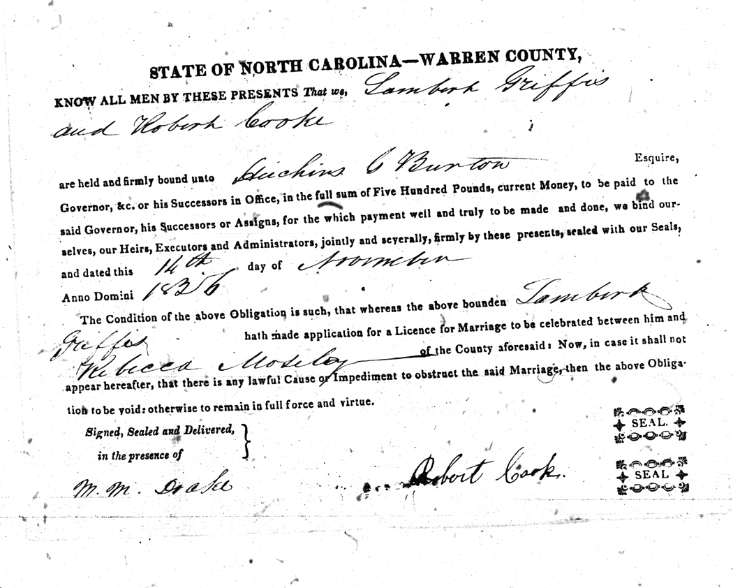 Griffis Lambert Moseley Rebecca 14 Nov 1826   Robert Cooke White