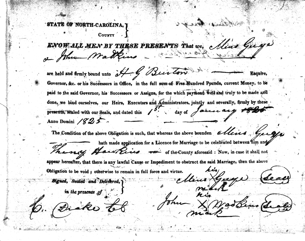 Guye Mins Hawkins Theny 01 Jan 1825   John Watkins Colored