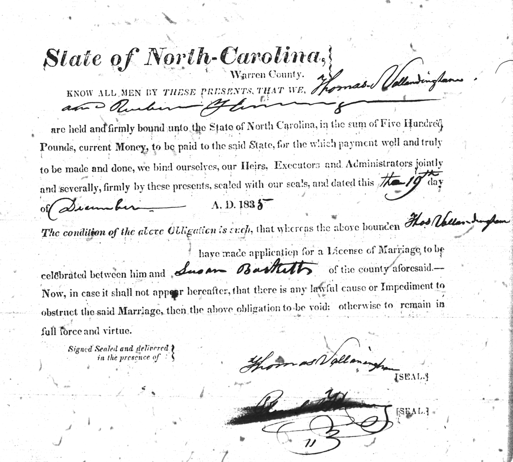 | Vanlandingham | Thomas | Baskett | Susan | 19 Dec 1835 | Reuben Yancey | White | |