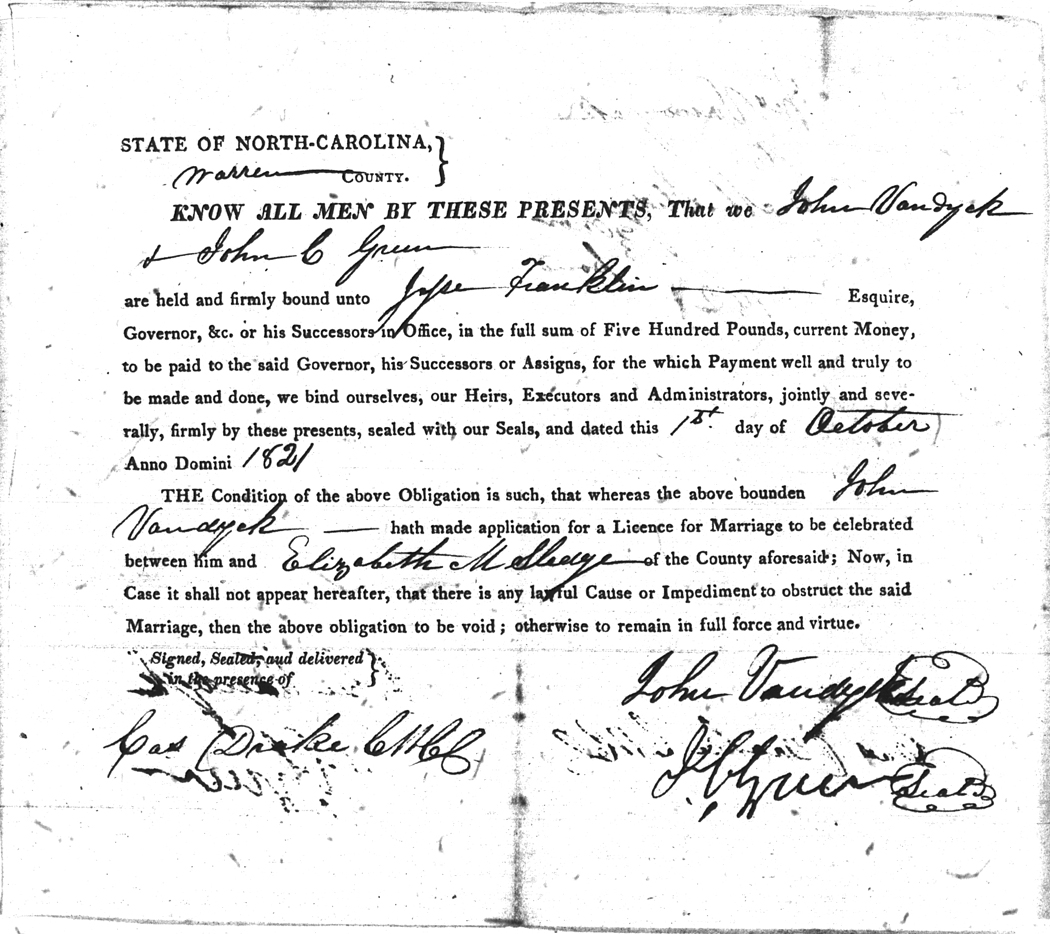 | Vandyck | John | Sledge | Elizabeth M. | 01 Oct 1821 | John C. Green | White | |