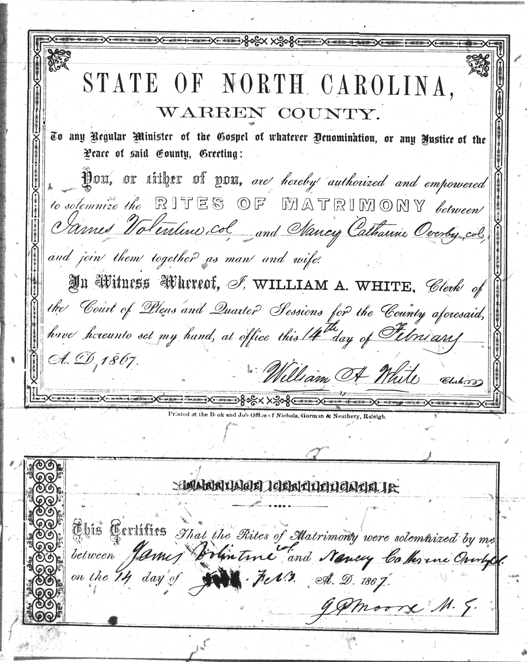 | Valentine | James | Overby | Nancy Catharine | 14 Feb 1867 | G. P. Moore | Colored | |
