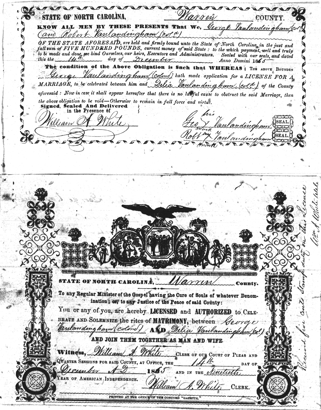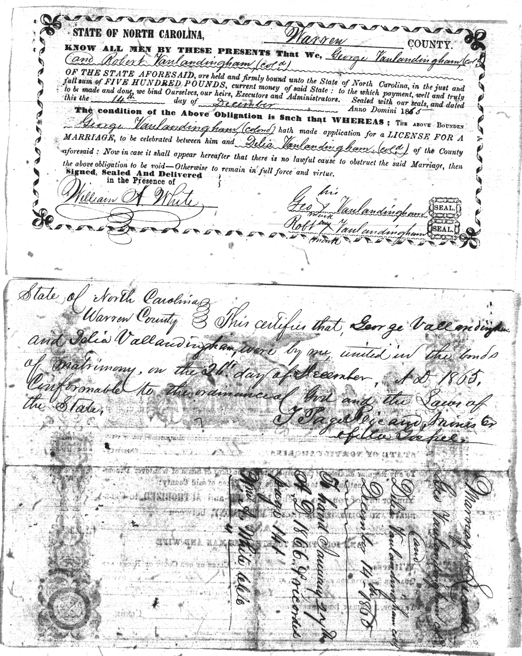 | Vanlandingham | George | Vanlandingham | Delia | 14 Dec 1865 | 14 Dec 1865 | Robert Vanlandingham | Colored |