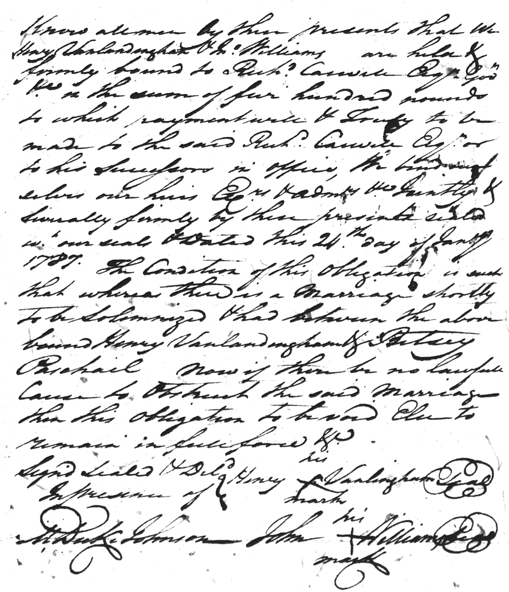 | Vanlandingham | Henry | Paschail | Betsey | 24 Jan 1787 | John Williams | White | |