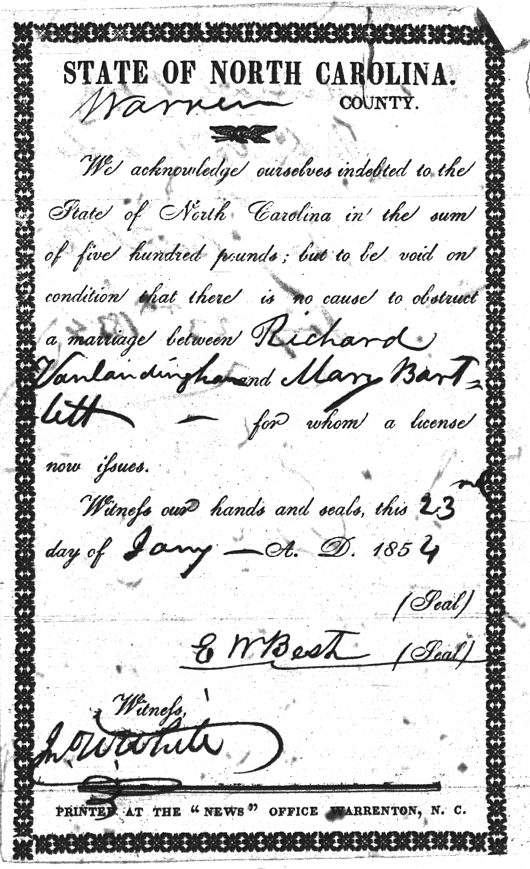 | Vanlandingham | Richard | Bartlett | Mary | 23 Jan 1854 | E. W. Best | White | |