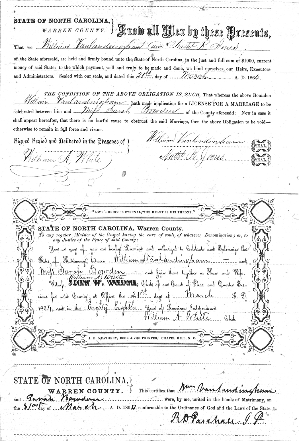 | Vanlandingham | William | Bowden | Sarah | 21 Mar 1864 | Nathaniel R. Jones | White | |