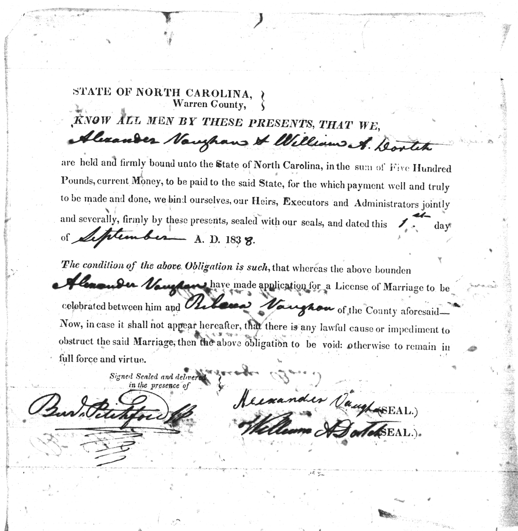 | Vaughan | Alexander | Vaughan | Rebecca | 01 Sep 1838 | William Dortch | White | |