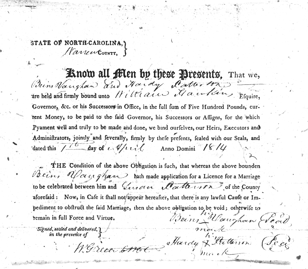 | Vaughan | Beins | Patterson | Susan | 01 Apr 1814 | Hardy Patterson | White | |
