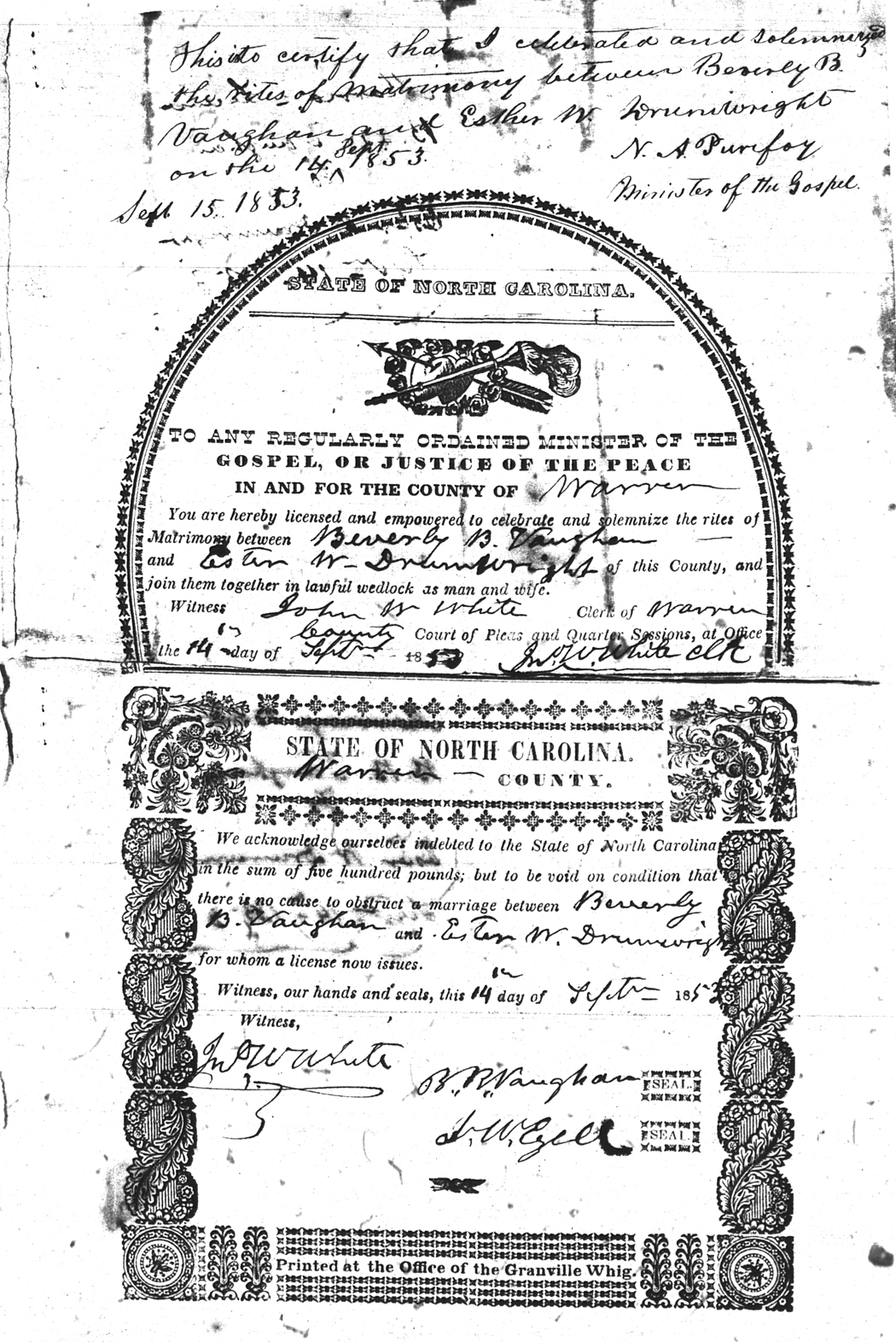 | Vaughan | Beverly B | Drumwright | Ester W | 14 Sep 1853 | J. W. Ezell | White | |