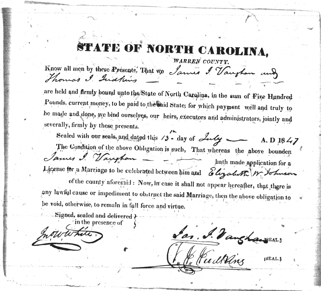 | Vaughan | James J | Johnson | Elizabeth W | 13 Jul 1847 | Thomas J. Judkins | White | |