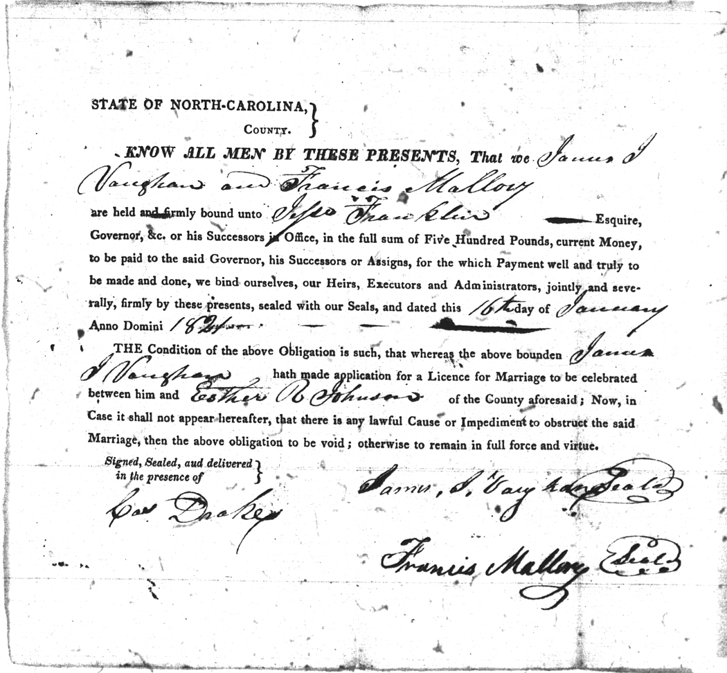 | Vaughan | James J | Johnson | Esther R. | 16 Jan 1821 | Francis Mallory | White | |