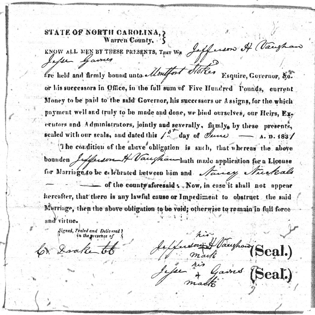 | Vaughan | Jefferson H | Nuckels | Nancy | 01 Jun 1831 | Jesse Garris | White | |