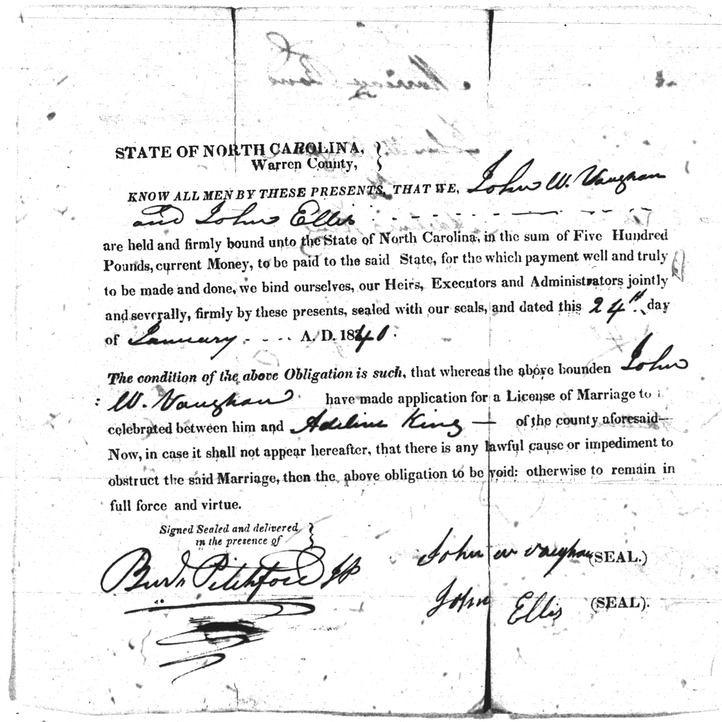 | Vaughan | John W | King | Adeline | 24 Jan 1840 | John Ellis | White | |