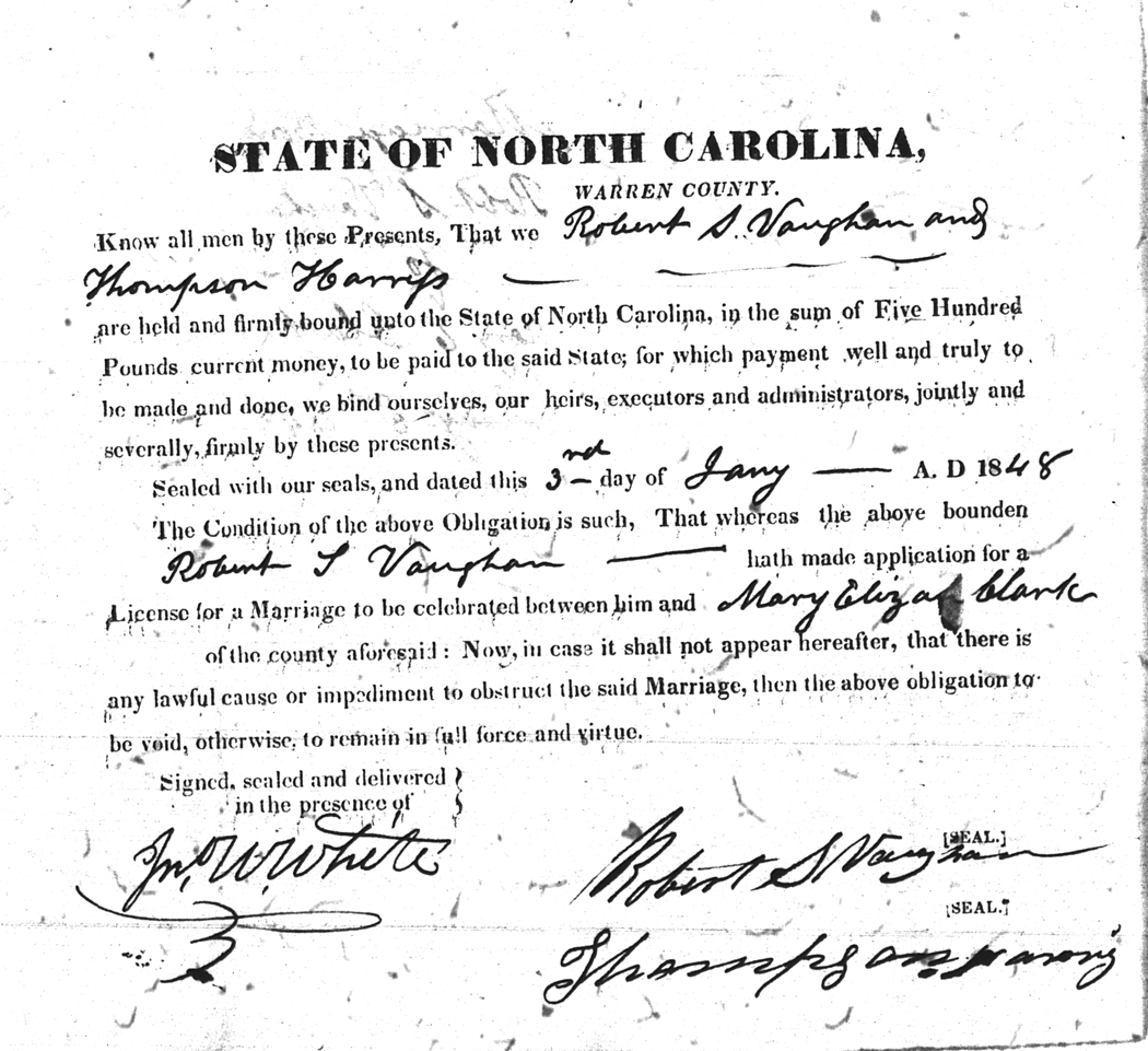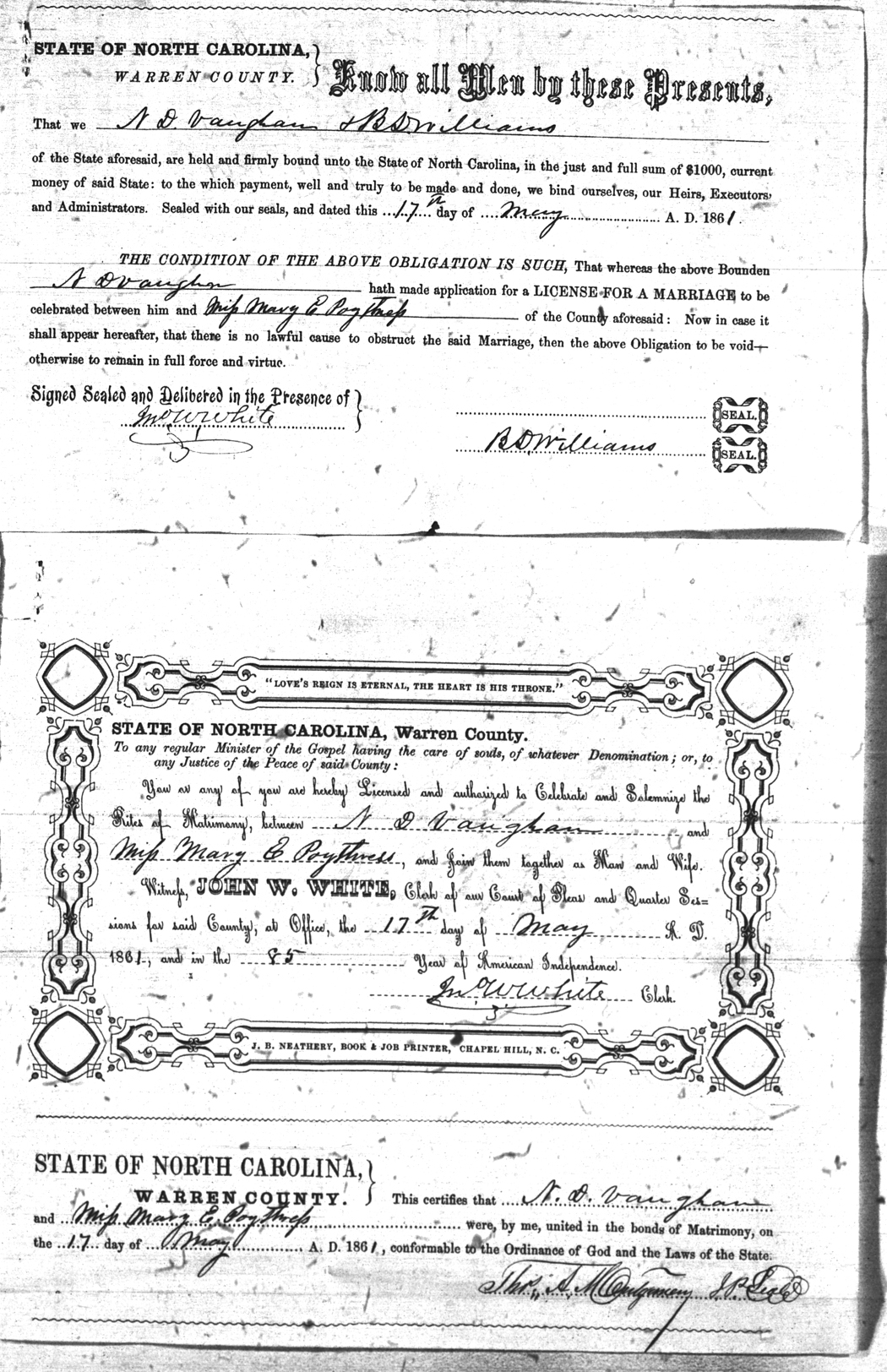 | Vaughan | N. D. | Poythress | Mary E. | 17 May 1861 | B. S. Williams | White | |
