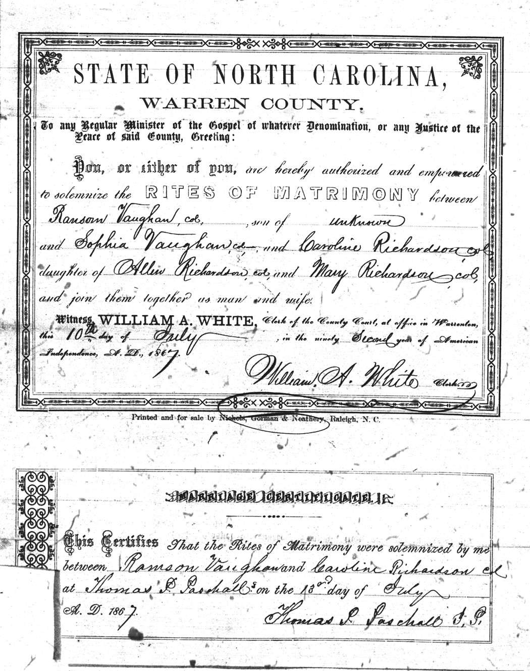 | Vaughan | Ransom | Richardson | Caroline | 10 Jul 1867 | Thomas P. Paschall | Colored | |
