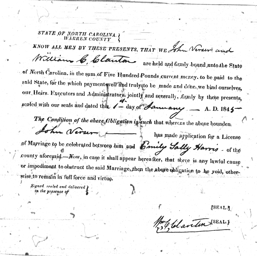 | Verser | John | Harris | Emily Sally | 01 Jan 1845 | William C. Clanton | White | |