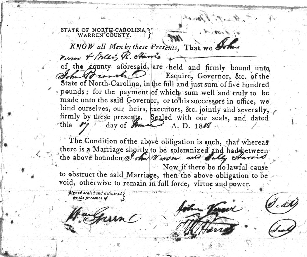 | Verser | John | Harris | Sally | 17 Jun 1818 | Willis R. Harris | White | |