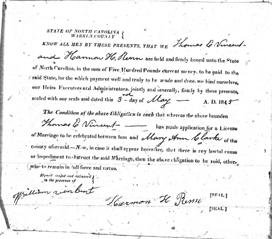 | Vincent | Thomas E | Clarke | Mary Ann | 03 May 1845 | Hammon H. Renn | White |
