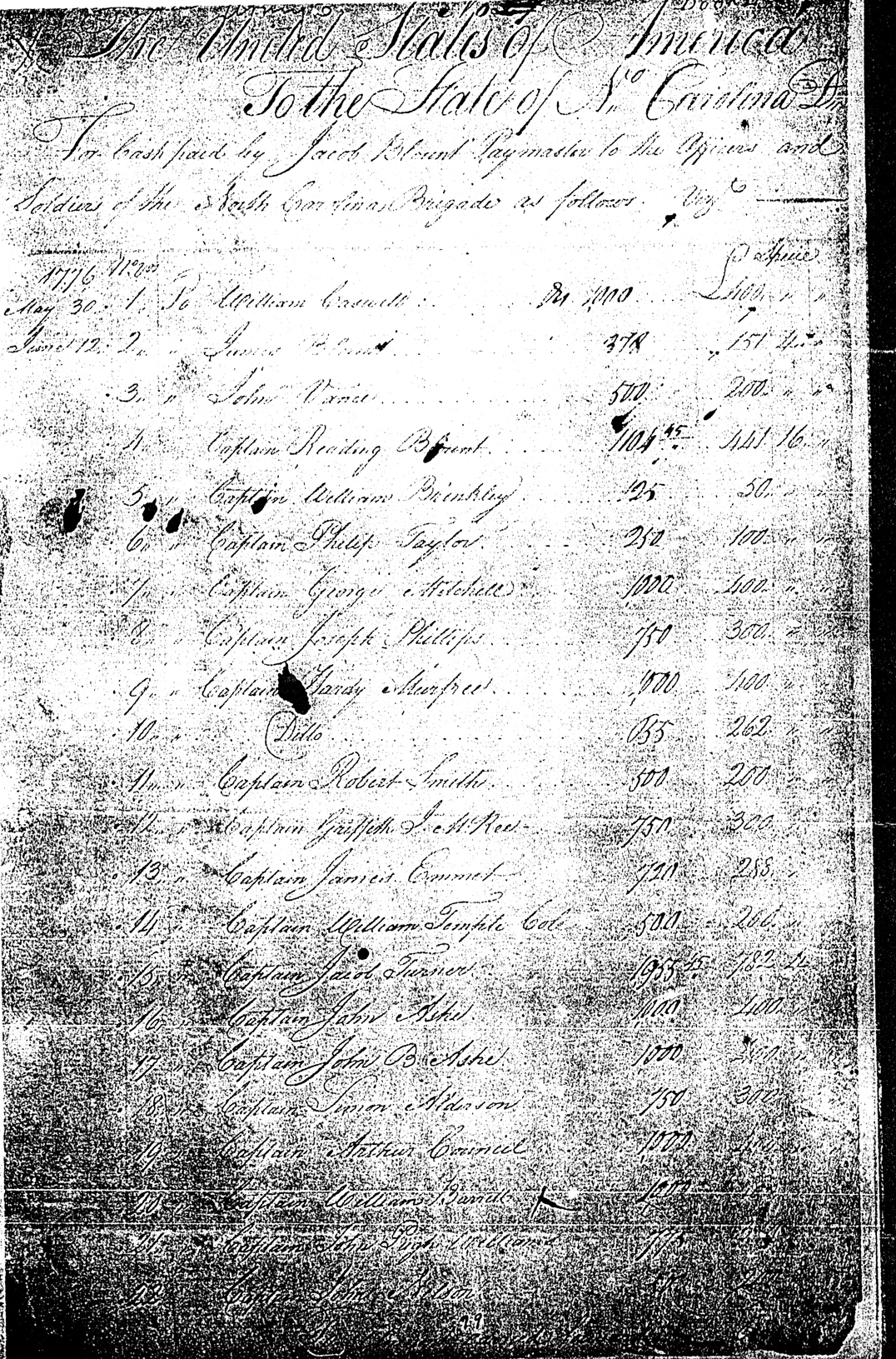 States of America to the State of No. Carolina For cash paid by Jacob Blout Paymaster to the Officers and Soldiers of the North Carolina Brigade as follows, Viz. 1776 May 30 Voucher No. Speice 1 William Caswell 1,000 £400 2 James Blount 378 £151.4 3 John Vance 500 £200 4 Captain Reading Blount 1104.45 £441.16 5 Captain William Brinkley 125 £50 6 Captain Philip Taylor 250 £100 7 Captain George Mitchell 1000 £400 8 Captain Joseph Phillips 750 £300 9 Captain Handy Murfree 1000 £400 10 ditto 655 £262 11 Captain Robert Smith 500 £200 12 Captain Griffith J. McRee 750 £300 13 Captain James Emmit 720 £288 14 Captain William Temple Cole 500 £200 15 Captain Jacob Turner 1955.45 £782.4 16 Captain John Ashe 1000 £400 17 Captain John B. Ashe 1000 £400 18 Captain Simon Alderson 750 £300 19 Captain Arthur Council 1000 £400 20 Captain William Barrett 1000 £400 21 Captain John Pugh Williams 775 £384 22 Captain John Nelson 500 £200
