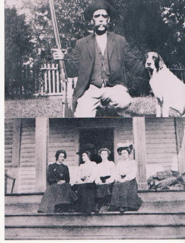 Peter Powell and his hunting dog; below that are several unknown female family members, probably sitting on Powell family porch. |