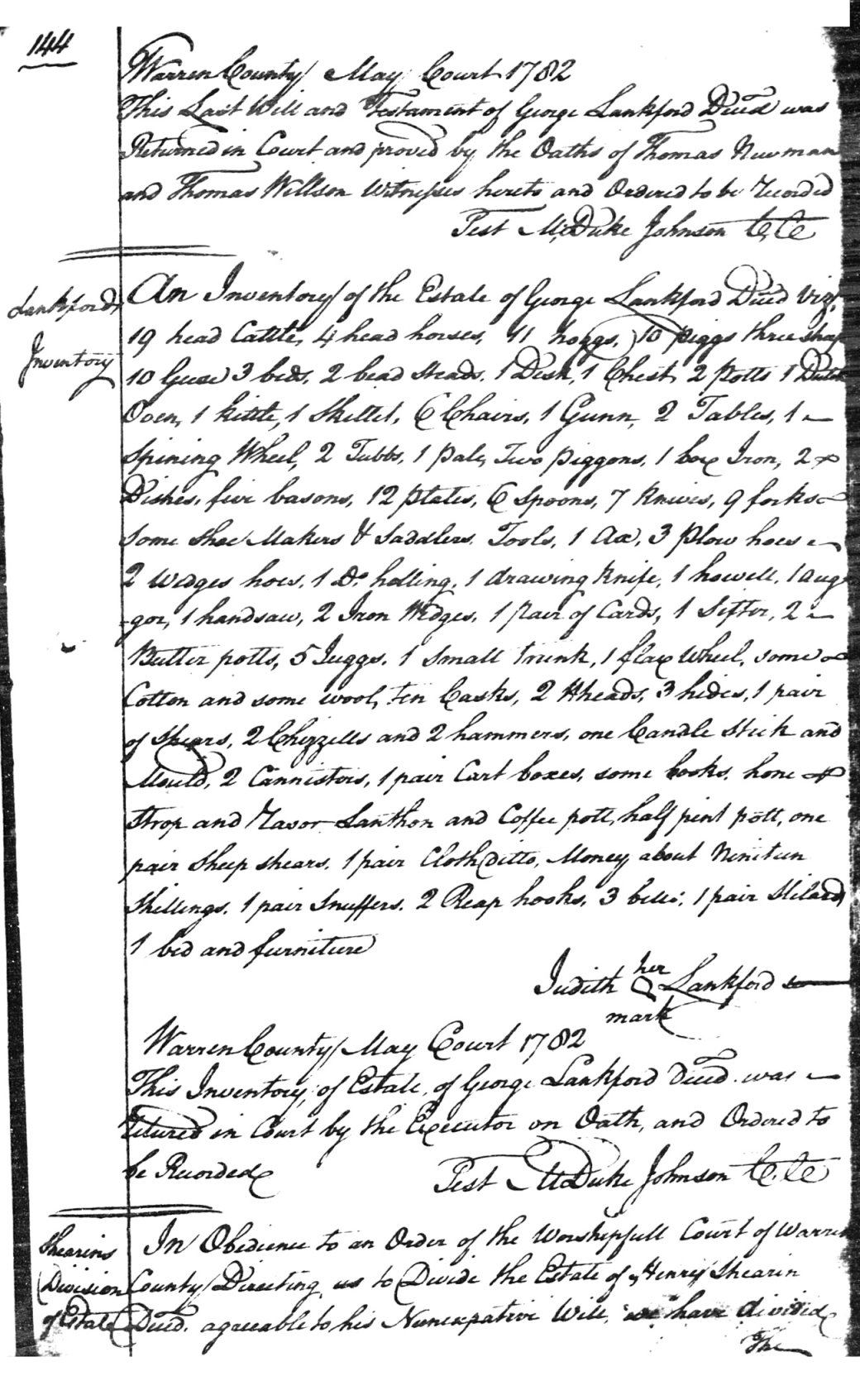 Thos. Newman Jurat On May 23, 1782, George Langford's will was proven in court as recorded in the Warren County, North Carolina Minutes to the Court of Pleas and Quarter Sessions. The actual court record entry is transcribed as follows: "The Last and Will and Testament of George Lankford, deceased, proved by the oath of Thomas Newman and Thomas Wilson, and on motion the same is ordered to be recorded. " |