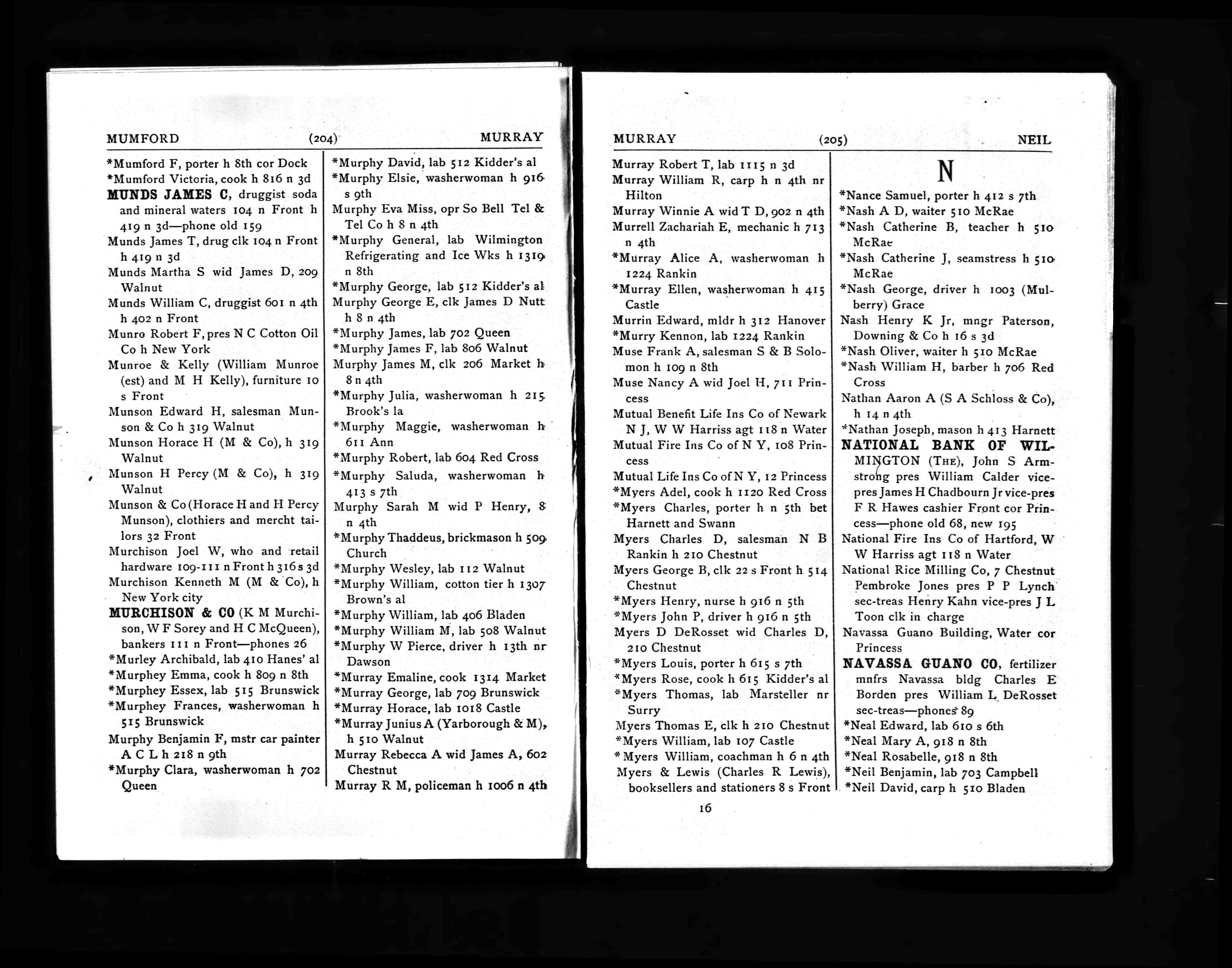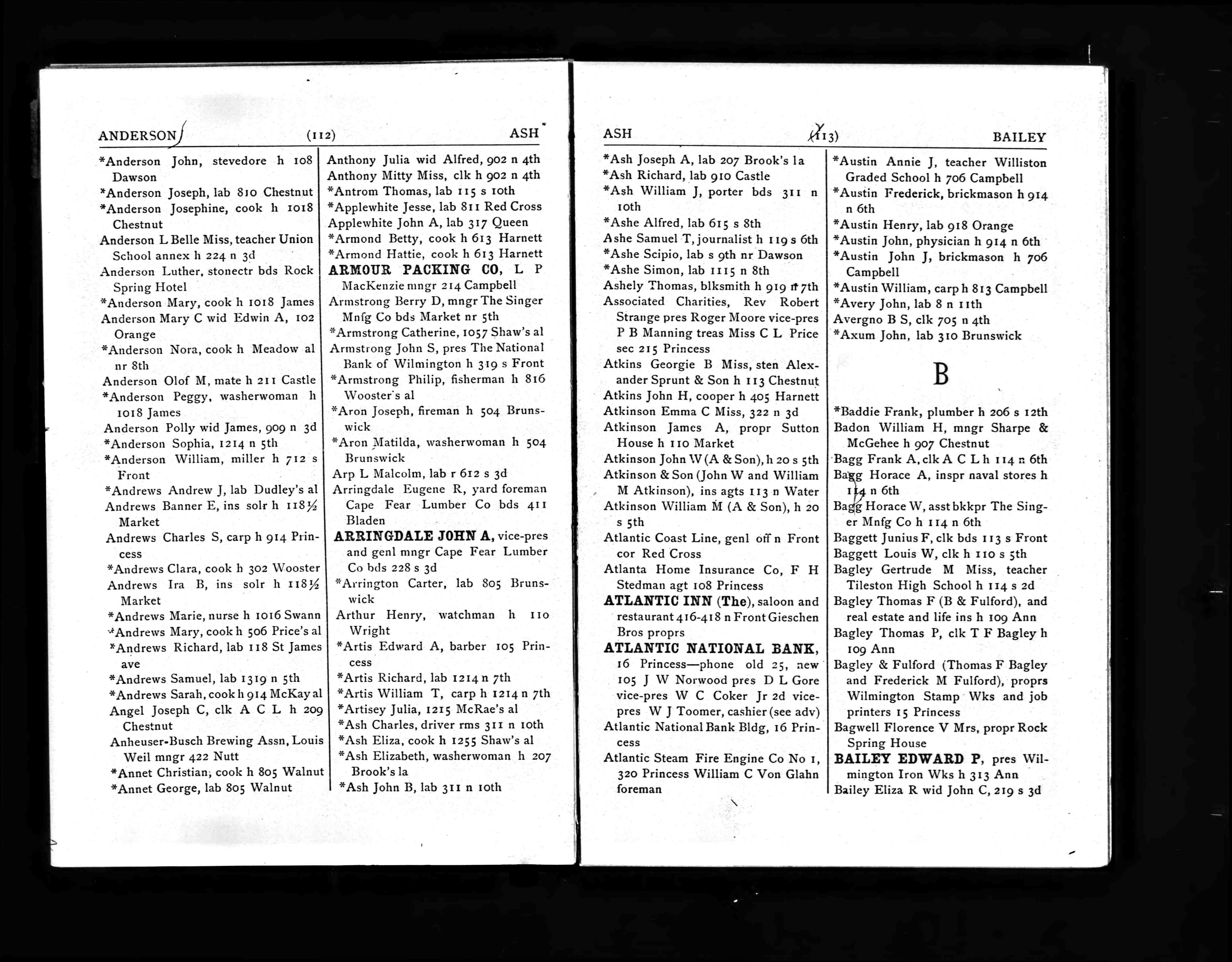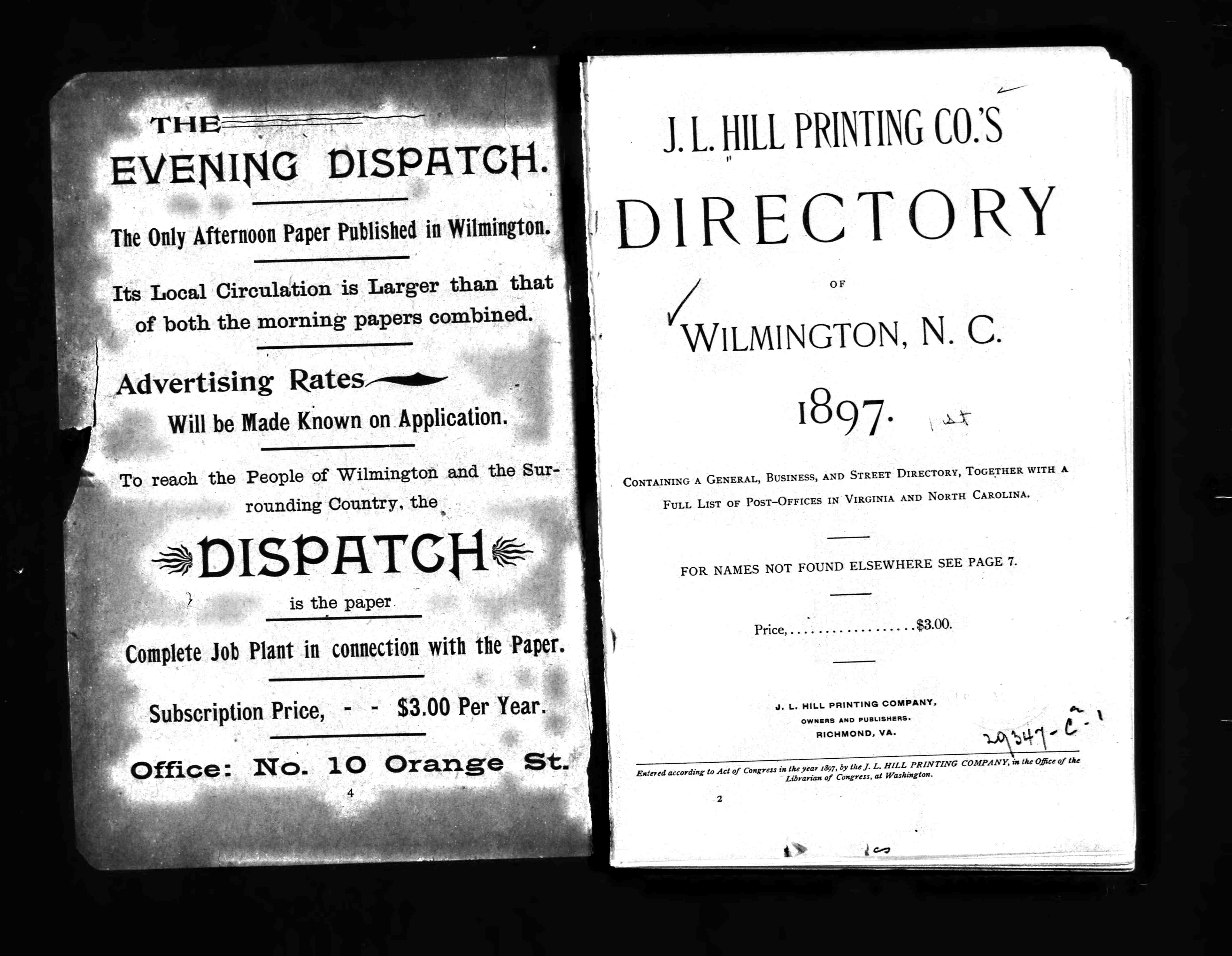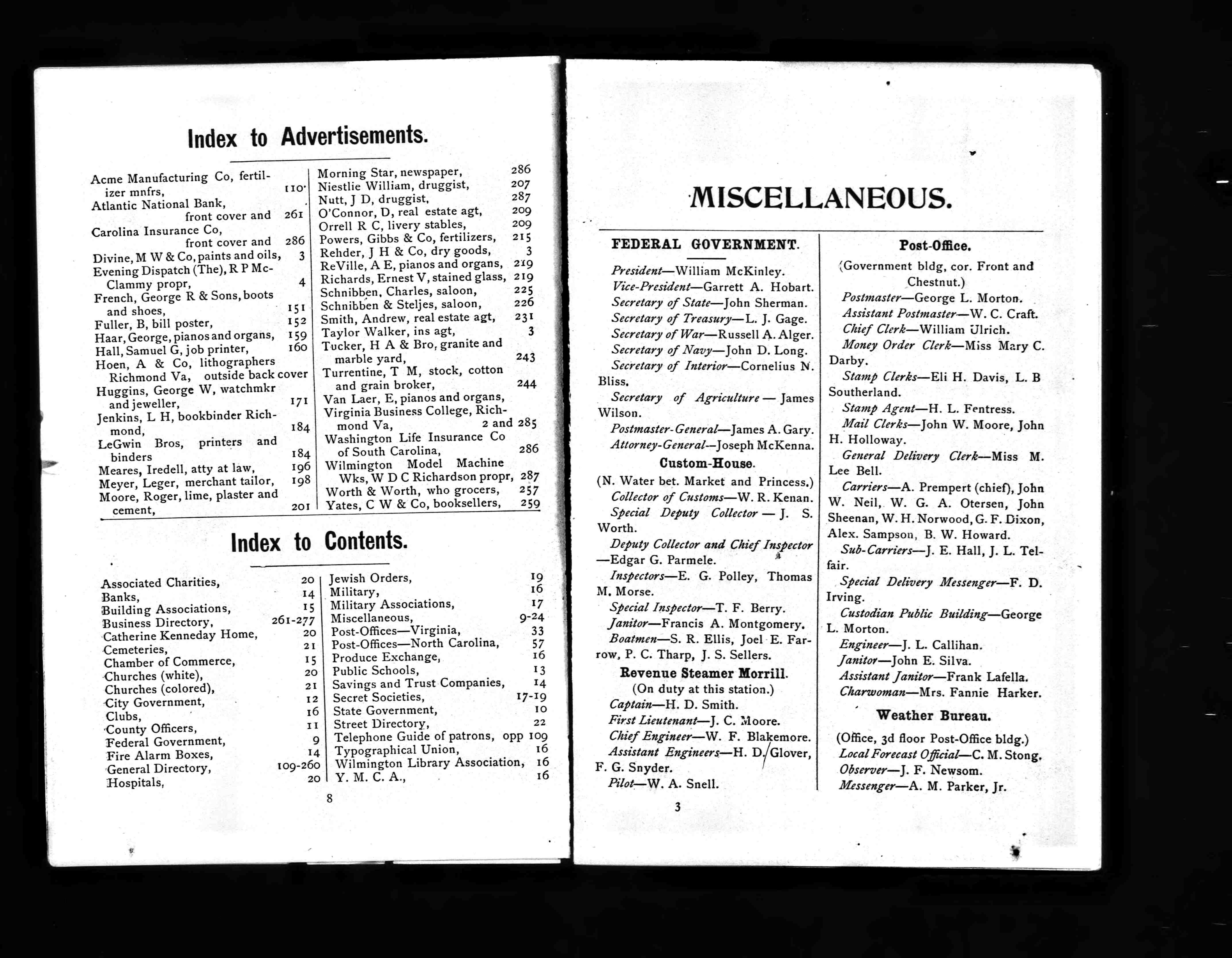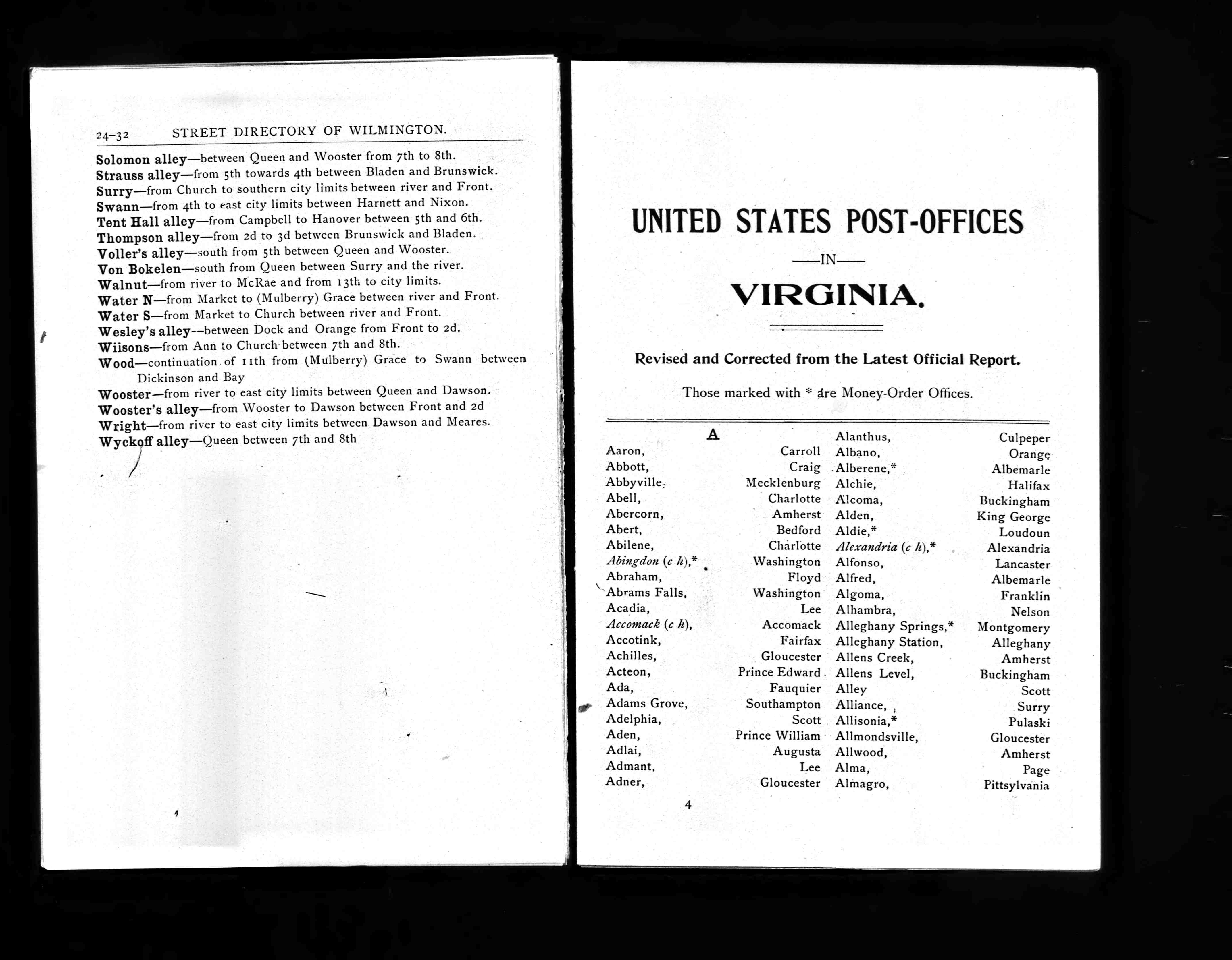 | inside cover advertisments 1 Title Page 2 advertisments 6 The City of Wilmington 7 Too Lates, Corrections, and Omissions 8 Indexes to Advertisements and Contents 10 Courts and State Government 12 City Government 14 Banks 16 Clubs & Societies 18 Societies 20 Churches, Cemeteries 22 Street Directory 24 Street Directory continued 34 US Post Offices in Virginia 36 US Post Offices in Virginia continued 38 US Post Offices in Virginia continued 40 US Post Offices in Virginia continued 42 US Post Offices in Virginia continued 44 US Post Offices in Virginia continued 46 US Post Offices in Virginia continued 48 US Post Offices in Virginia continued 50 US Post Offices in Virginia continued 52 US Post Offices in Virginia continued 54 US Post Offices in Virginia continued 56 US Post Offices in Virginia continued 58 US Post Offices in Virginia continued 60 US Post Offices in Virginia continued 62 US Post Offices in Virginia continued 64 US Post Offices in Virginia continued 66 US Post Offices in Virginia continued 68 US Post Offices in Virginia continued 70 US Post Offices in Virginia continued 72 US Post Offices in Virginia continued 74 US Post Offices in North Carolina 76 US Post Offices in North Carolina continued 78 US Post Offices in North Carolina continued 80 US Post Offices in North Carolina continued 82 US Post Offices in North Carolina continued 84 US Post Offices in North Carolina continued 86 US Post Offices in North Carolina continued 88 US Post Offices in North Carolina continued 90 US Post Offices in North Carolina continued 92 US Post Offices in North Carolina continued 94 US Post Offices in North Carolina continued 96 US Post Offices in North Carolina continued 98 US Post Offices in North Carolina continued 100 US Post Offices in North Carolina continued 102 US Post Offices in North Carolina continued 104 US Post Offices in North Carolina continued 106 US Post Offices in North Carolina continued 108 US Post Offices in North Carolina continued 109 Abbott - Addison 110 Addison - Anderson 112 Anderson - Bailey 114 Bailey - Bear 116 Bear - Bell 117 Bell - Benson 118 Benson - Bland 120 Bland - Bowden 122 Bowden - Bright 124 Bright - Brown 126 Brown - Burbank 128 Burch - Canaday 130 Canaday - Carter 132 Cartret - Clemensen 134 Clement - Cornegie 136 Cornich - Crosswell 138 Crosswell - Davis 140 Davis - DeVon 142 DeVon - Dudley 144 Dudley - Ennett |