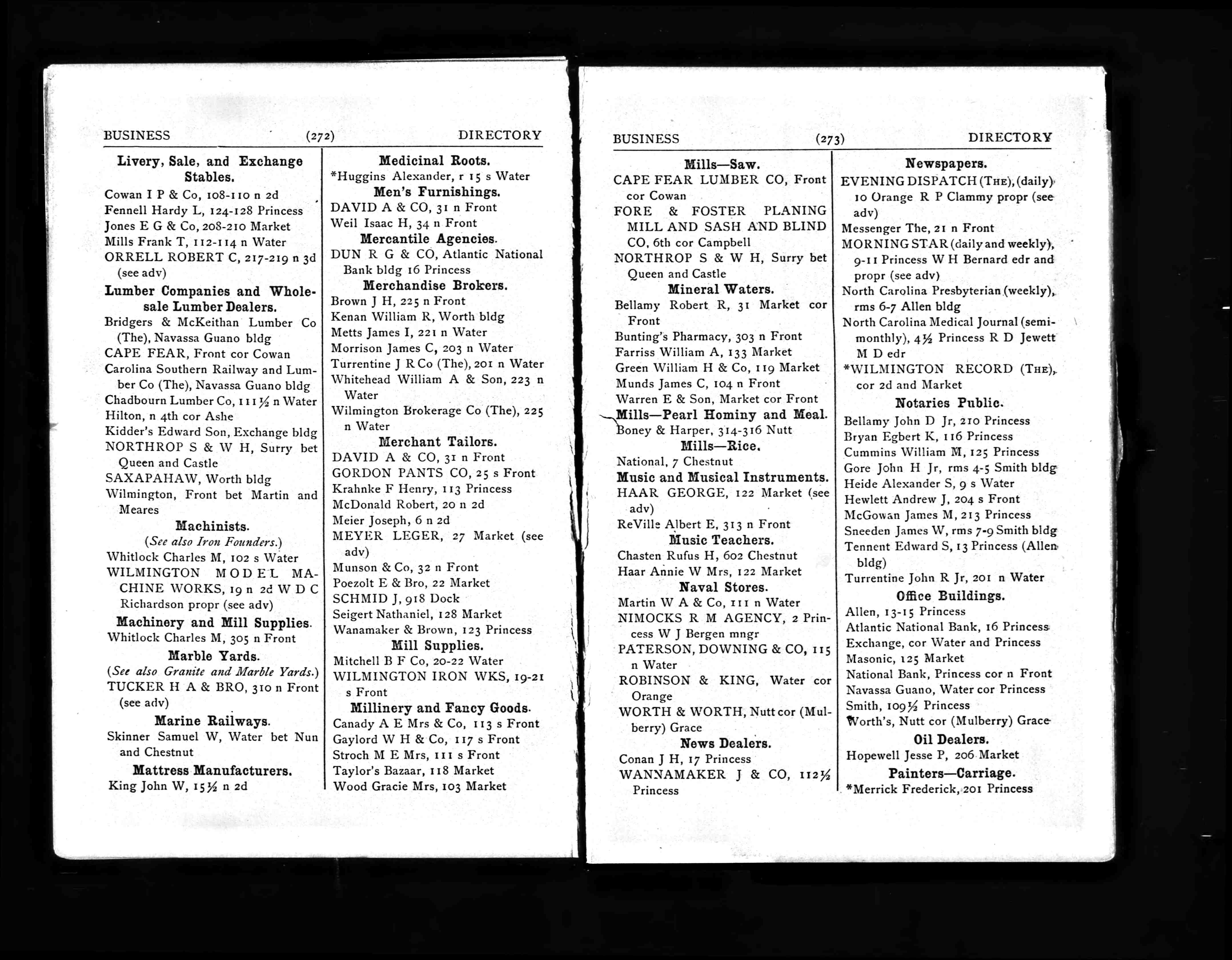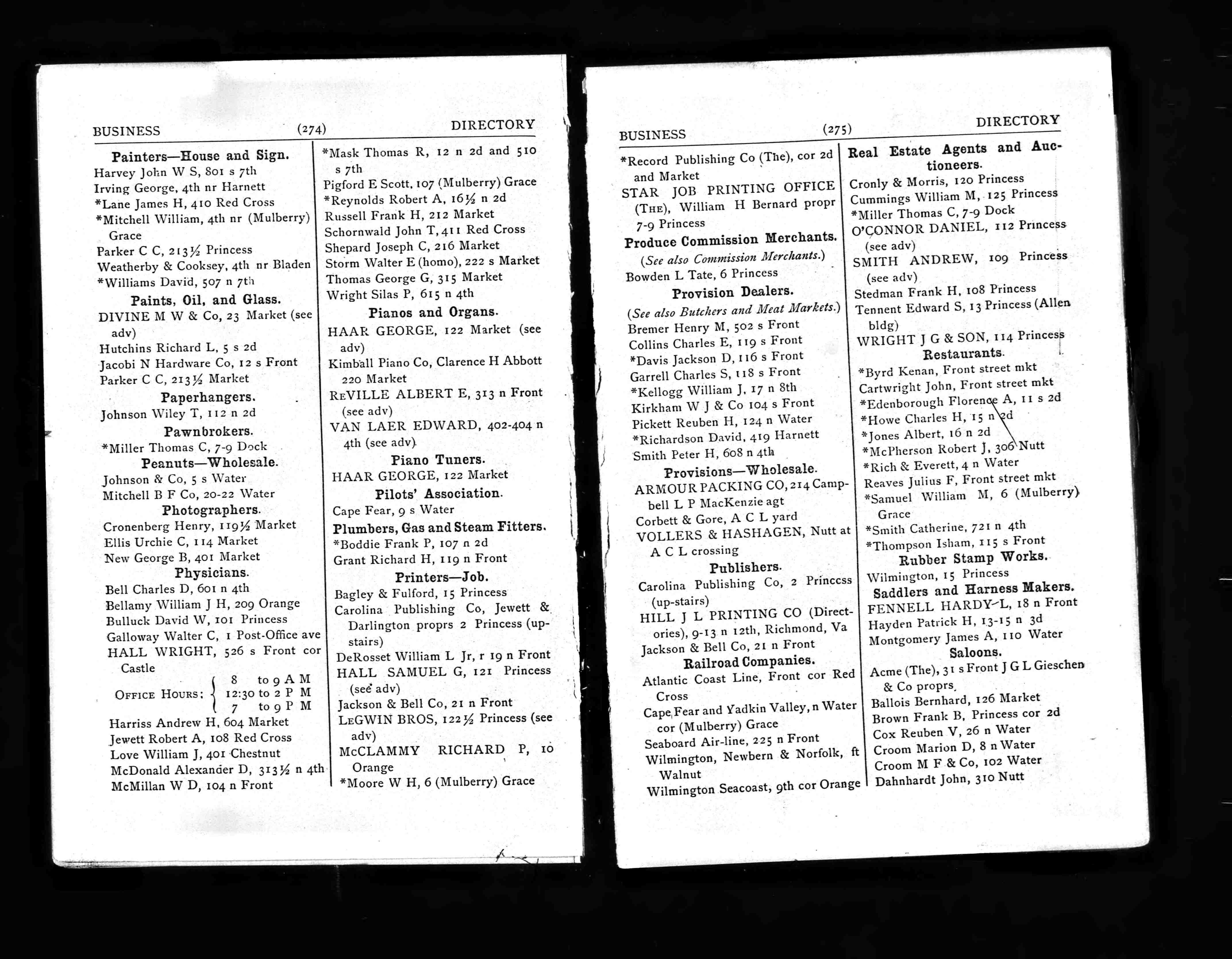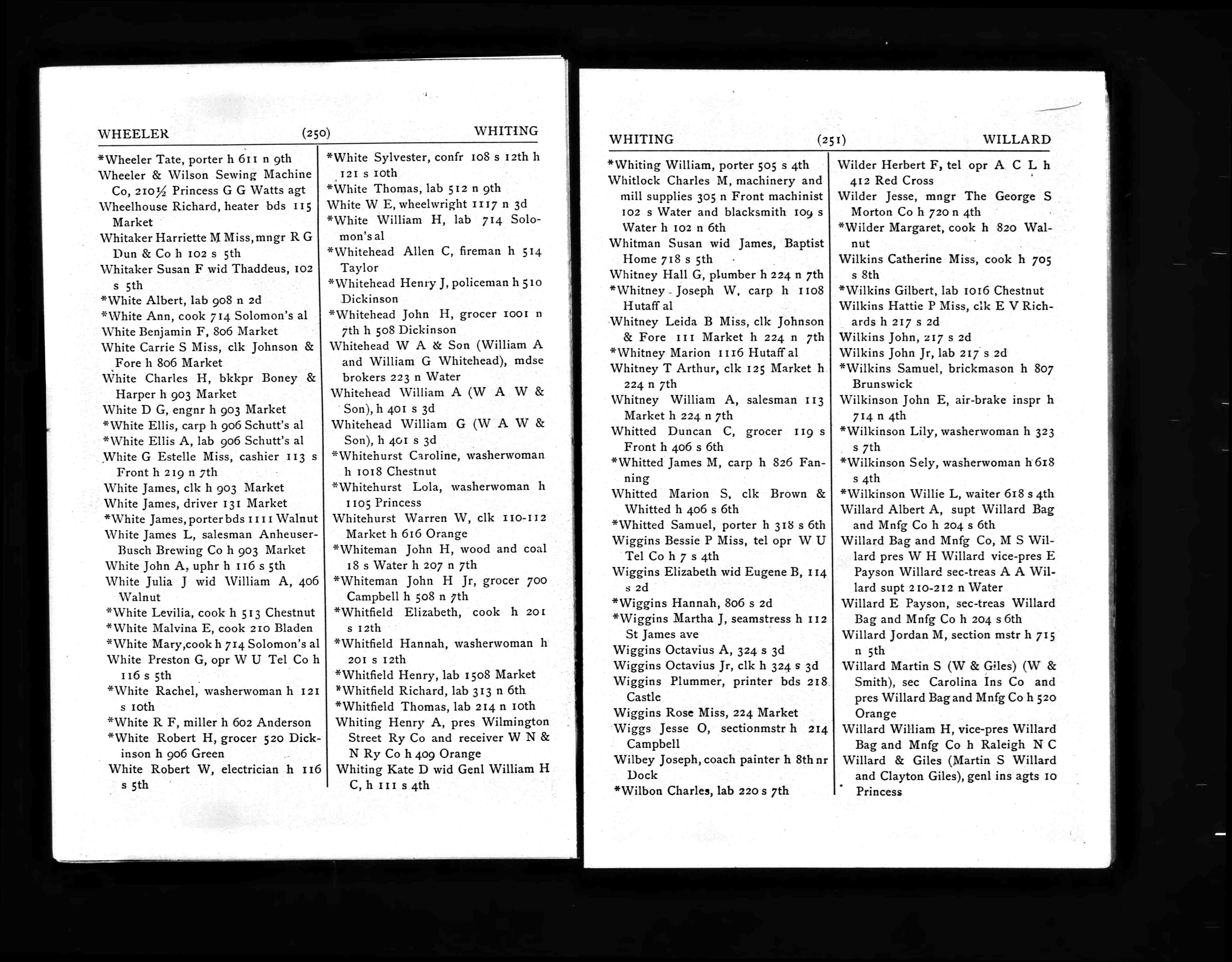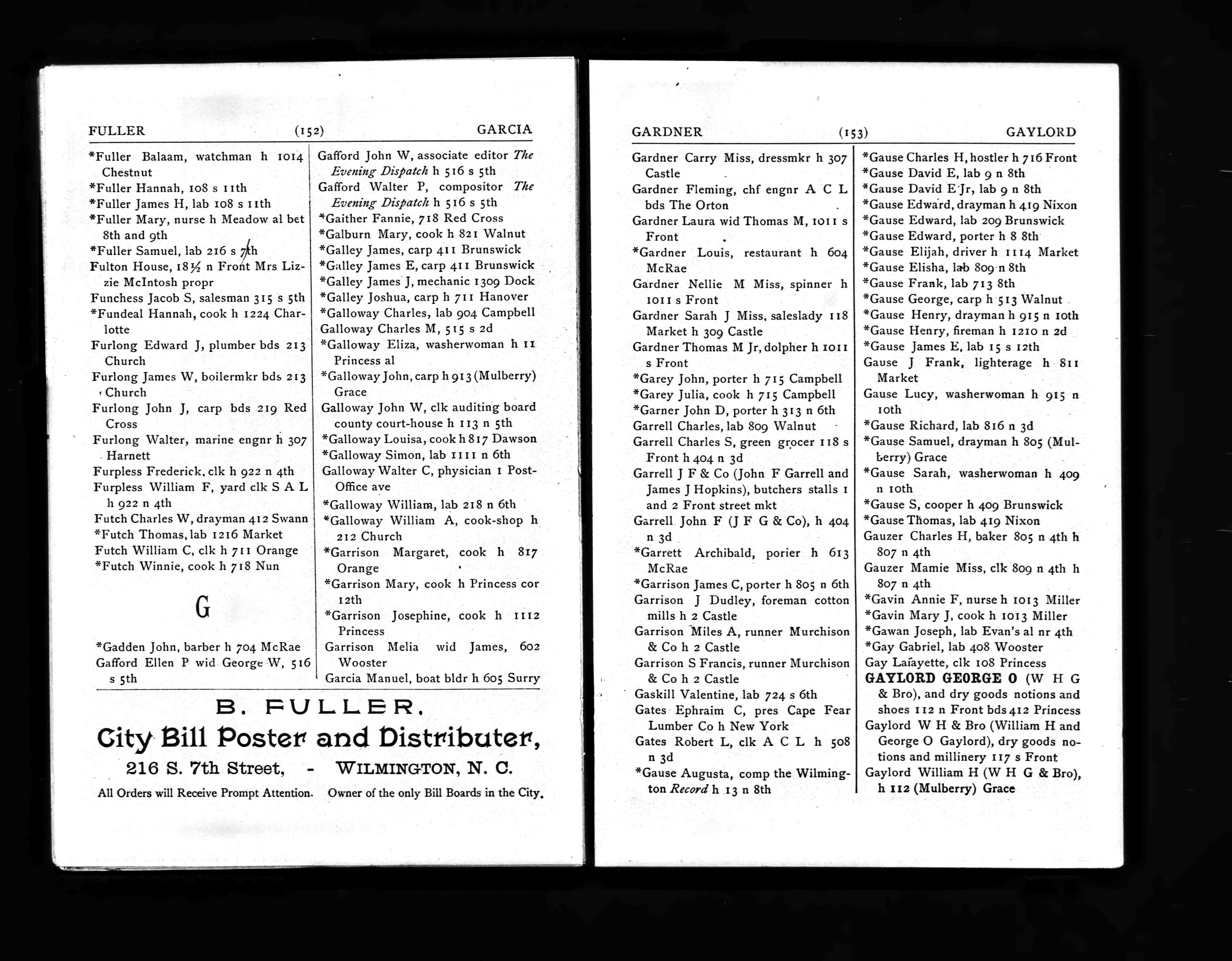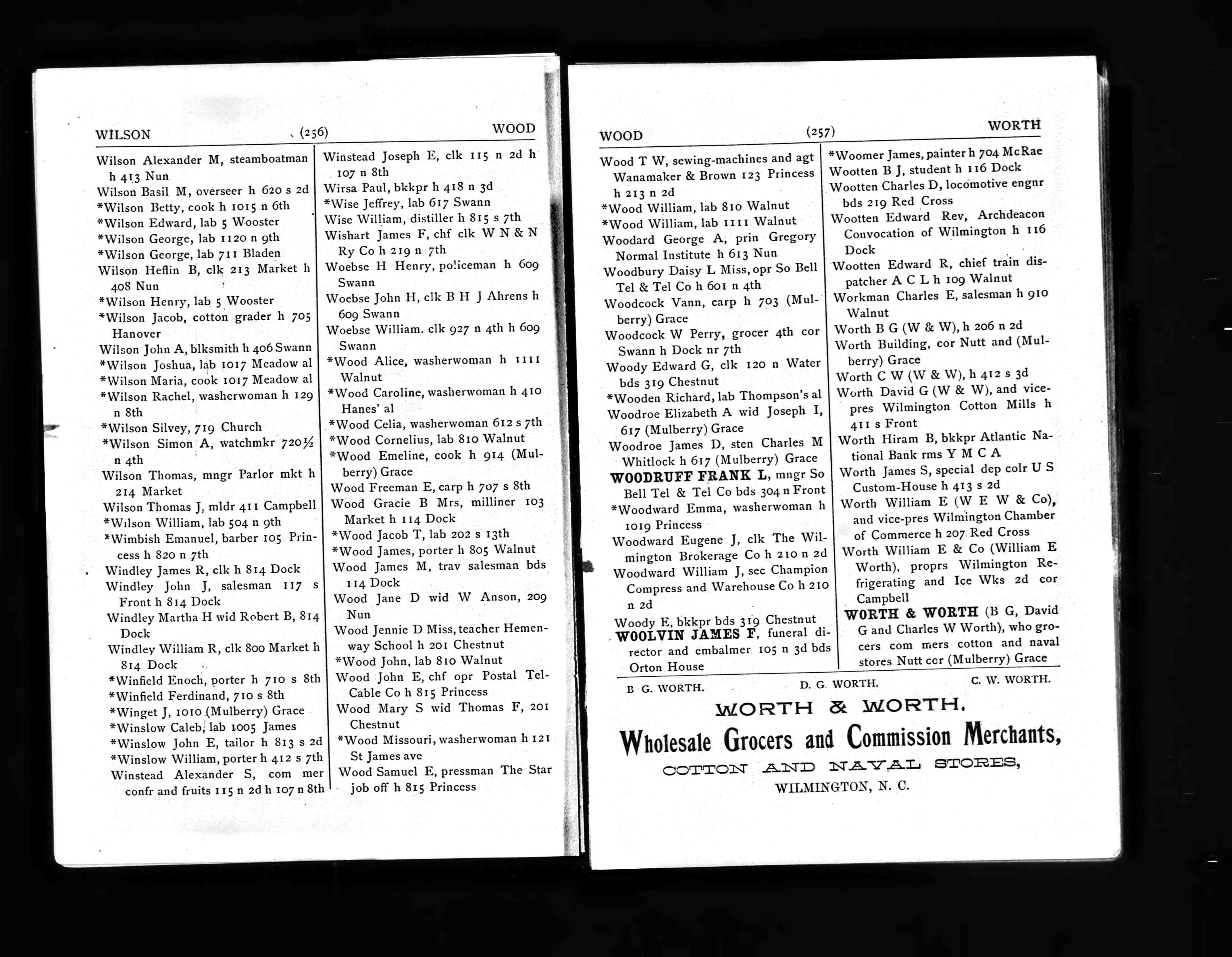 146 Ennett - Farrar 148 Farrell - Foster 150 Foster - Fuller 152 Fuller - Gaylord 154 Geams - Gore 156 Gore - Grier 158 Grier - Hall 160 Hall - Hanover 162 Hanscom - Hawes 164 Hawes - Herring 166 Herring - Hodges 168 Hodges - Howard 170 Howard - Humphrey 172 Humphrey - Jacobs 174 Jacobs - Johnson 176 Johnson - Jones 178 Jones - Kenan 180 Kendall - Koonce 182 Koonce - LeBoo 184 LeBoo - Litgen 186 Litgen - McCab 188 McCalister - McFarland 190 McFarland - McLaurin 192 McLaurine - MacKenzie 194 MacRae - Mask 196 Mason - Merrick 198 Merrick - Mitchell 200 Mitchell - Moore 202 Moore - Muller 204 Mumford - Neil 206 Neil - Nixon 208 Nobles - Ortmann 210 Ortmann - Pearsall 212 Pearsall - Pierce 214 Pierce - Prease 216 Prease - Reaves 218 Reaves - Richardson 220 Richardson - Robinson 222 Robinson - St James 224 St James - Schnibben 226 Schnibben - Shepard 228 Shepard - Skey 230 Skinner - Smith 232 Smith - Southerland 234 Southerland - Steljes 266 Steljes - Suggs 238 Suggs - Taylor 240 Taylor - Thorburn 242 Thorburn - Tyler 244 Tyler - Wade 246 Wade - Waters 248 Watrous - Wheeler 250 Wheeler - Willard 252 Willard - Williams 254 Williams - Wilmington 256 Wilson - Worth 258 Wortham - Young 260 Young - Zoeller Business Directory 261 Advertising Companies - Barbers 262 Barbers - Chemical Companies 264 China Decorators and Painters - Dressmakers 266 Dressmakers - Grocers 268 Grocers - Hatters 270 Hay, Grain and Feed Dealers - Lithographers 272 Livery Sale and Exchange Stables - Painters: Carriage 274 Painters: House and Sign - Saloons 276 Saloons - Wood Dealers 286 advertisements 287 advertisements |