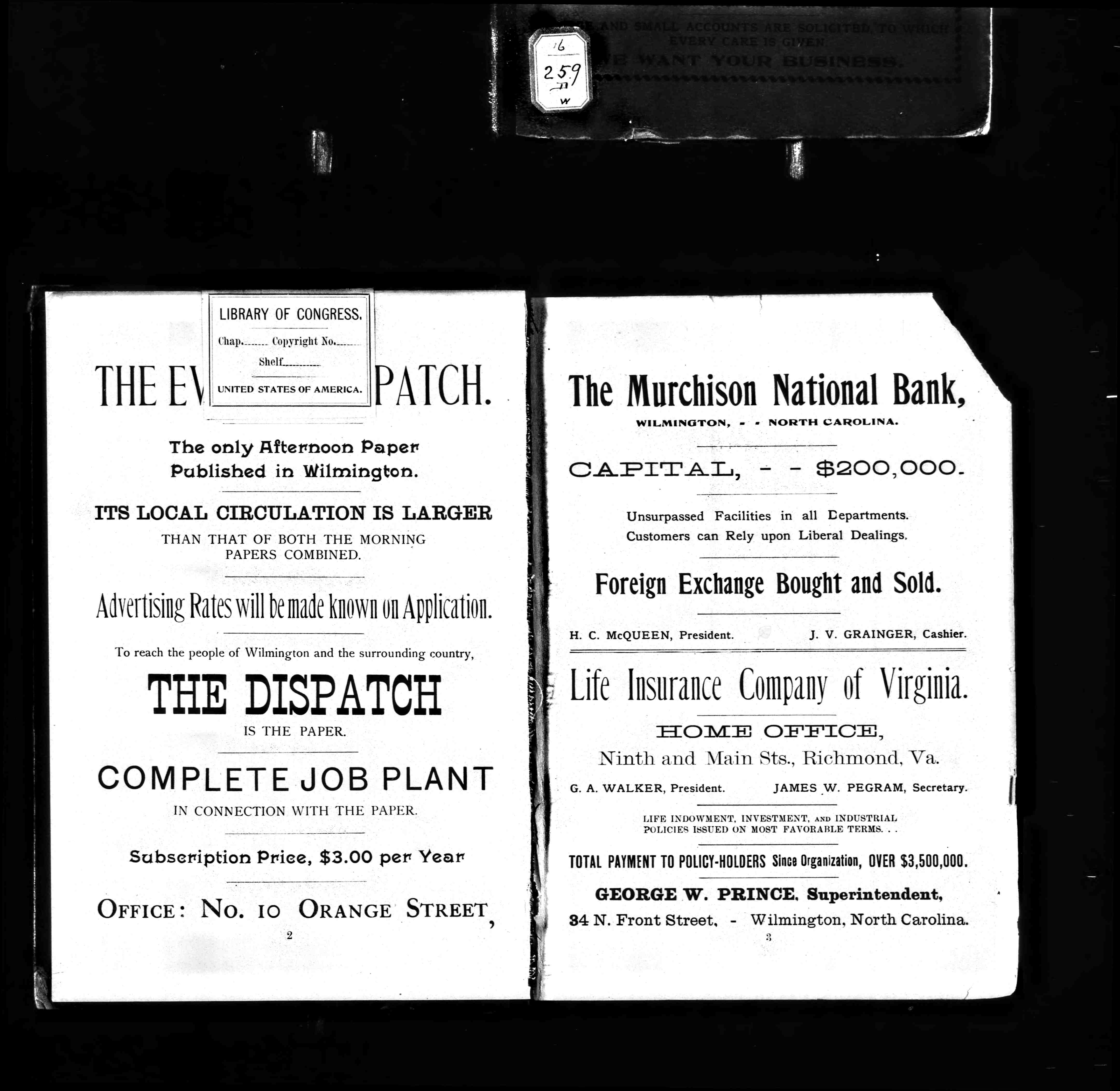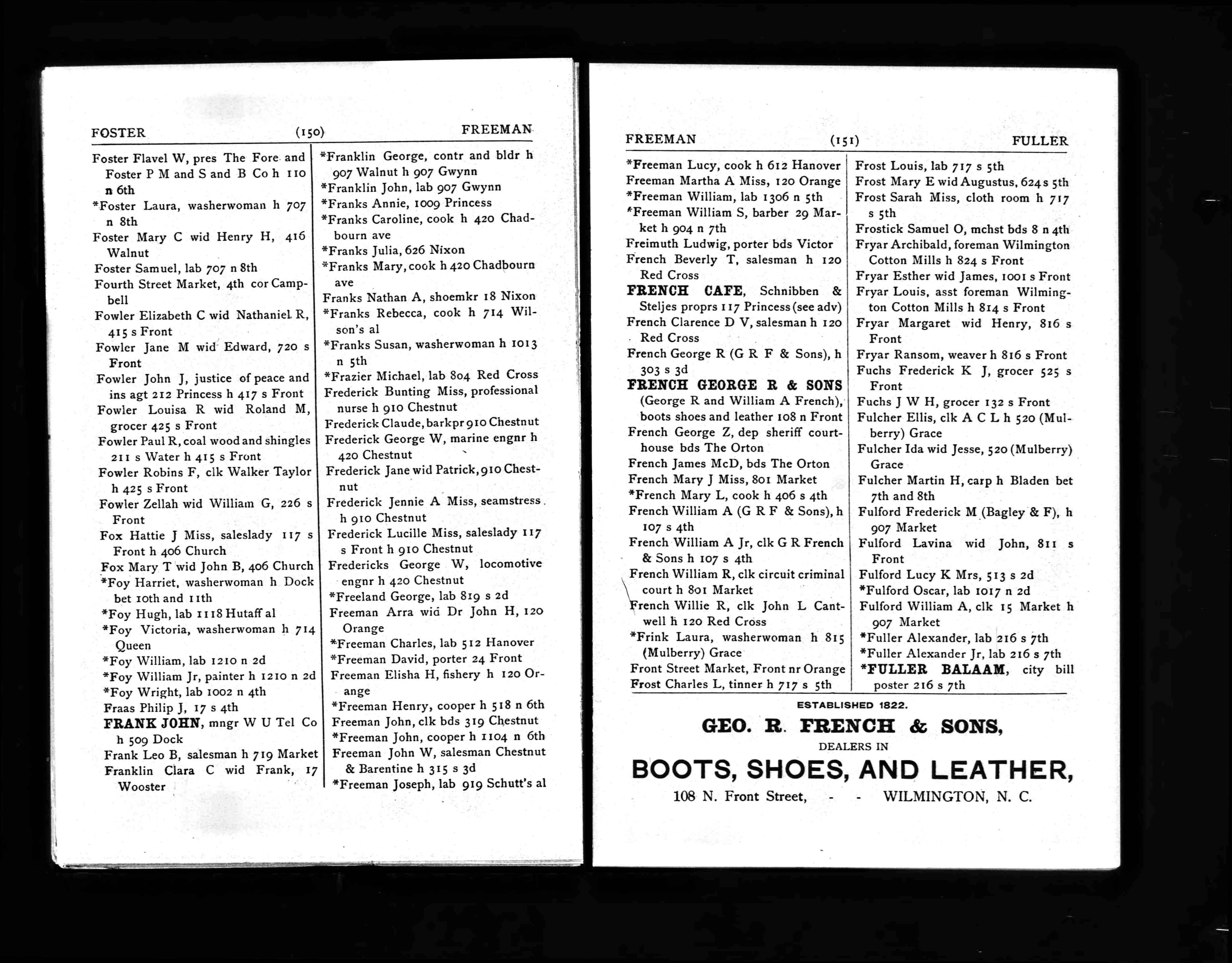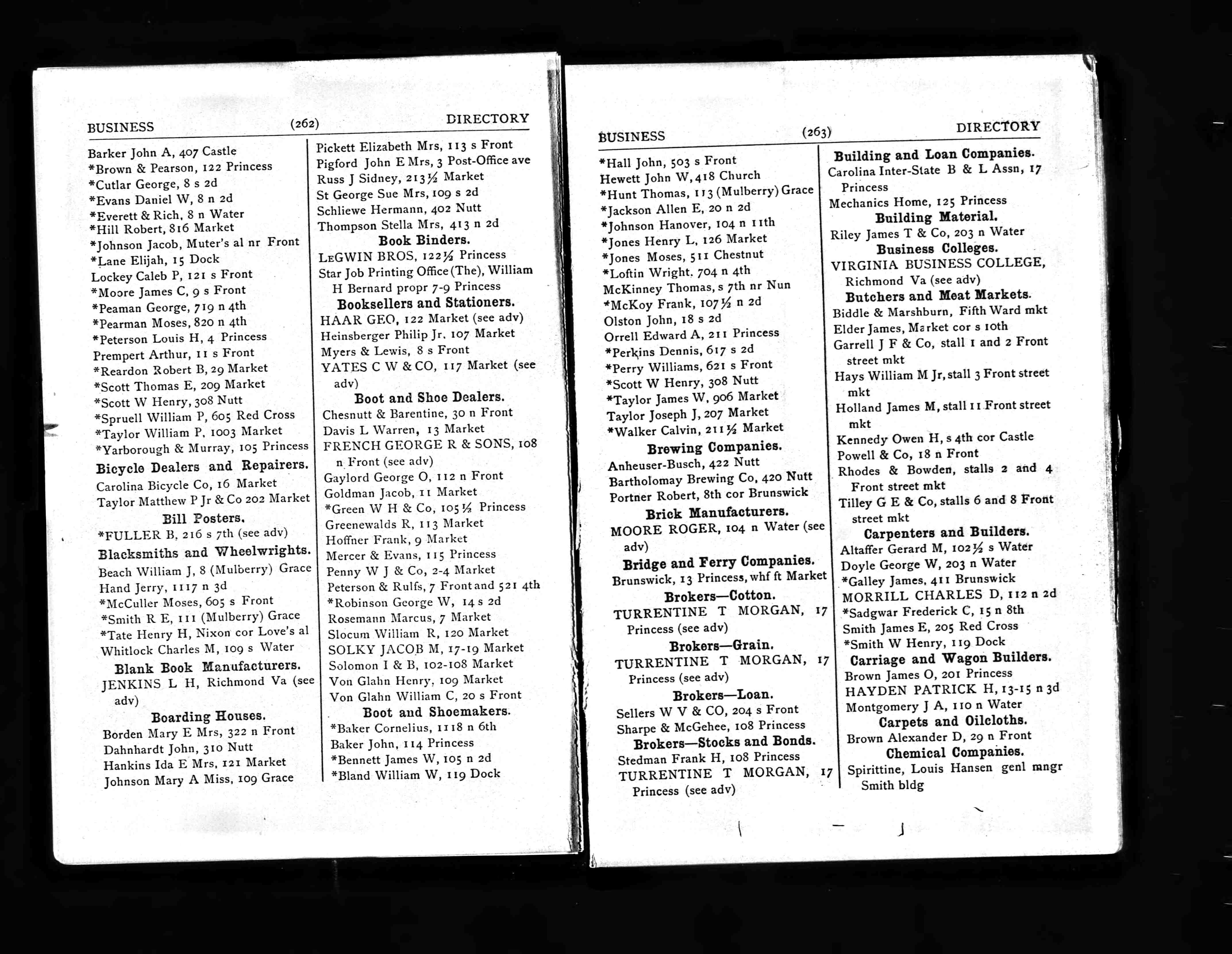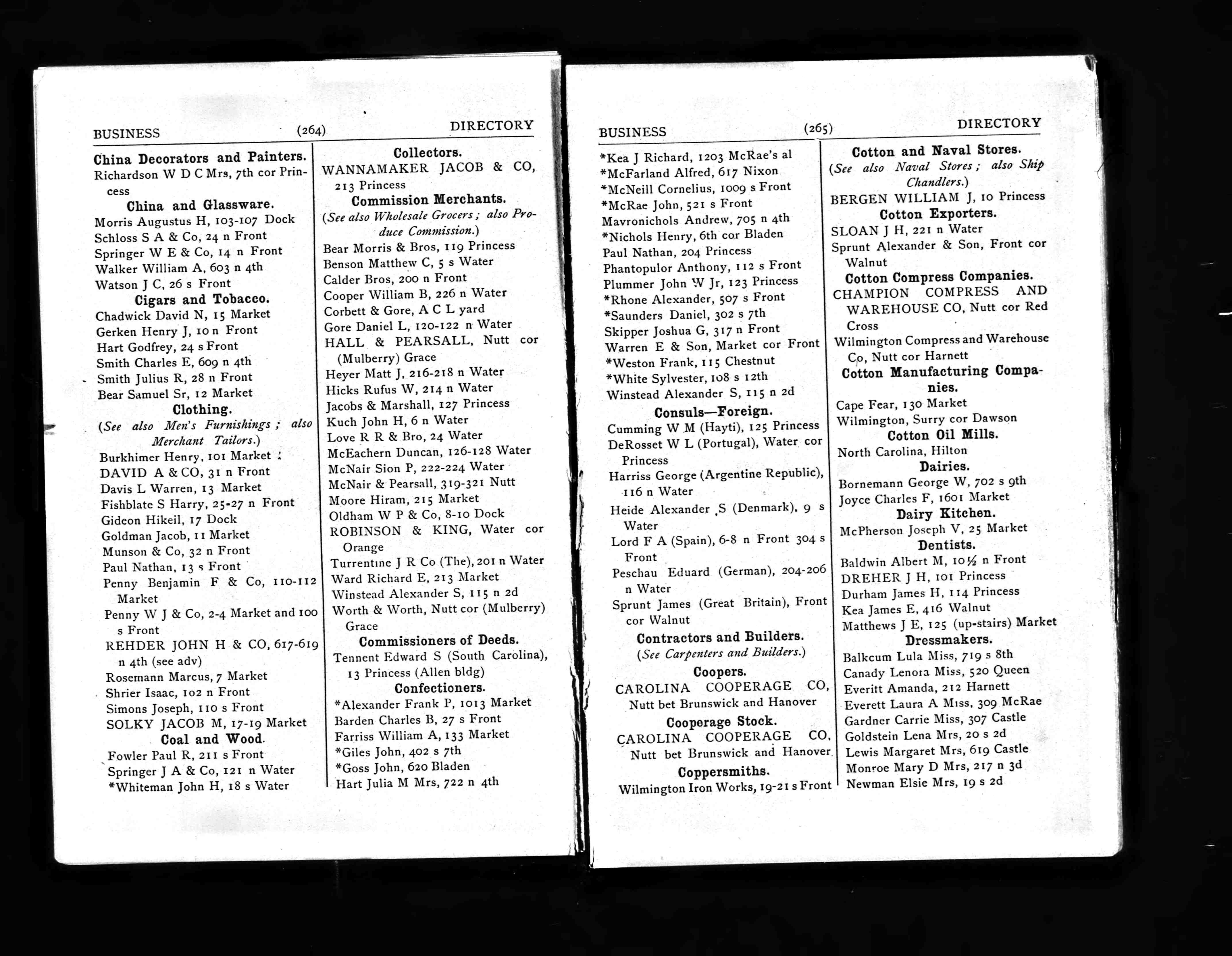 146 Ennett - Farrar 148 Farrell - Foster 150 Foster - Fuller 152 Fuller - Gaylord 154 Geams - Gore 156 Gore - Grier 158 Grier - Hall 160 Hall - Hanover 162 Hanscom - Hawes 164 Hawes - Herring 166 Herring - Hodges 168 Hodges - Howard 170 Howard - Humphrey 172 Humphrey - Jacobs 174 Jacobs - Johnson 176 Johnson - Jones 178 Jones - Kenan 180 Kendall - Koonce 182 Koonce - LeBoo 184 LeBoo - Litgen 186 Litgen - McCab 188 McCalister - McFarland 190 McFarland - McLaurin 192 McLaurine - MacKenzie 194 MacRae - Mask 196 Mason - Merrick 198 Merrick - Mitchell 200 Mitchell - Moore 202 Moore - Muller 204 Mumford - Neil 206 Neil - Nixon 208 Nobles - Ortmann 210 Ortmann - Pearsall 212 Pearsall - Pierce 214 Pierce - Prease 216 Prease - Reaves 218 Reaves - Richardson 220 Richardson - Robinson 222 Robinson - St James 224 St James - Schnibben 226 Schnibben - Shepard 228 Shepard - Skey 230 Skinner - Smith 232 Smith - Southerland 234 Southerland - Steljes 266 Steljes - Suggs 238 Suggs - Taylor 240 Taylor - Thorburn 242 Thorburn - Tyler 244 Tyler - Wade 246 Wade - Waters 248 Watrous - Wheeler 250 Wheeler - Willard 252 Willard - Williams 254 Williams - Wilmington 256 Wilson - Worth 258 Wortham - Young 260 Young - Zoeller Business Directory 261 Advertising Companies - Barbers 262 Barbers - Chemical Companies 264 China Decorators and Painters - Dressmakers 266 Dressmakers - Grocers 268 Grocers - Hatters 270 Hay, Grain and Feed Dealers - Lithographers 272 Livery Sale and Exchange Stables - Painters: Carriage 274 Painters: House and Sign - Saloons 276 Saloons - Wood Dealers 286 advertisements 287 advertisements |