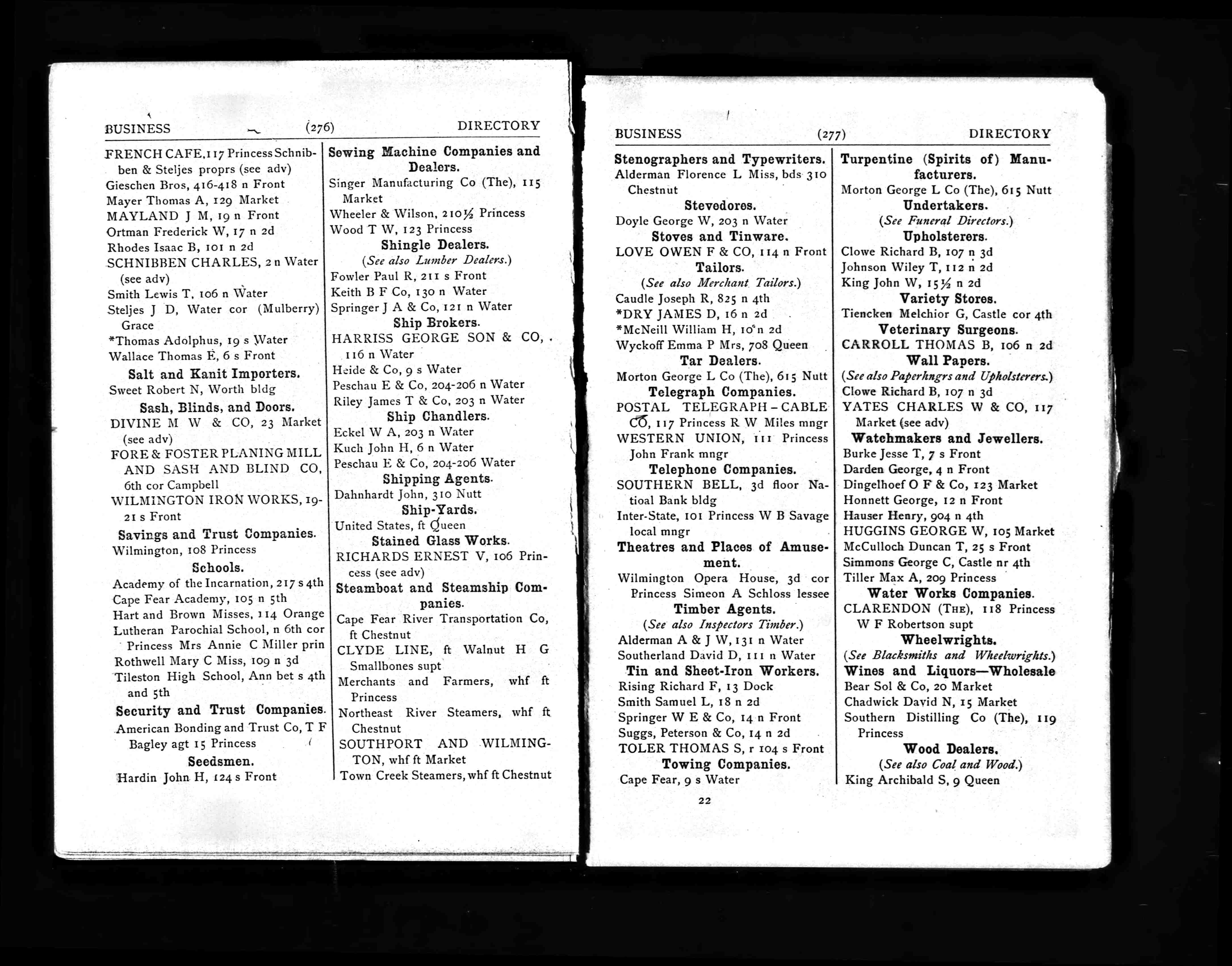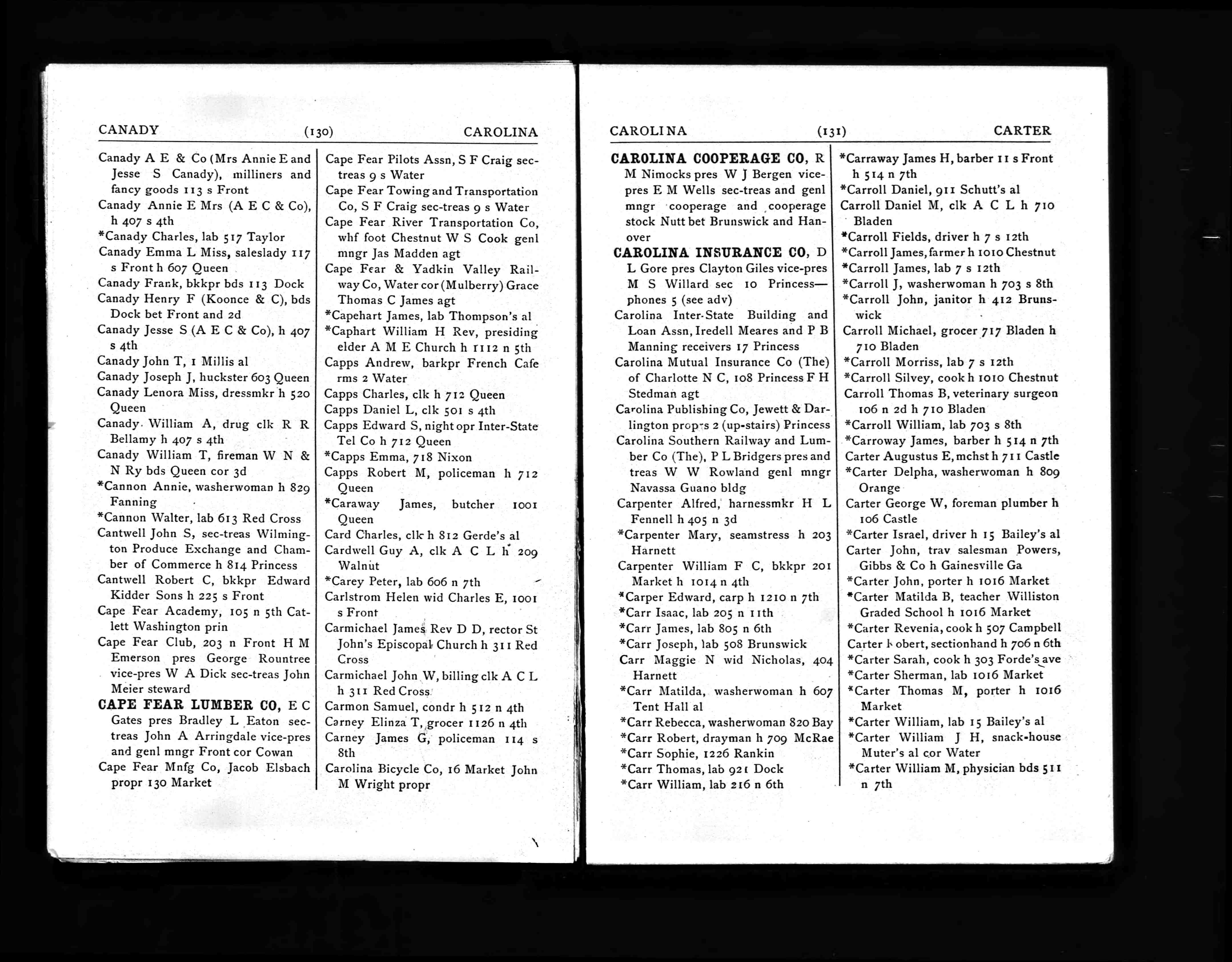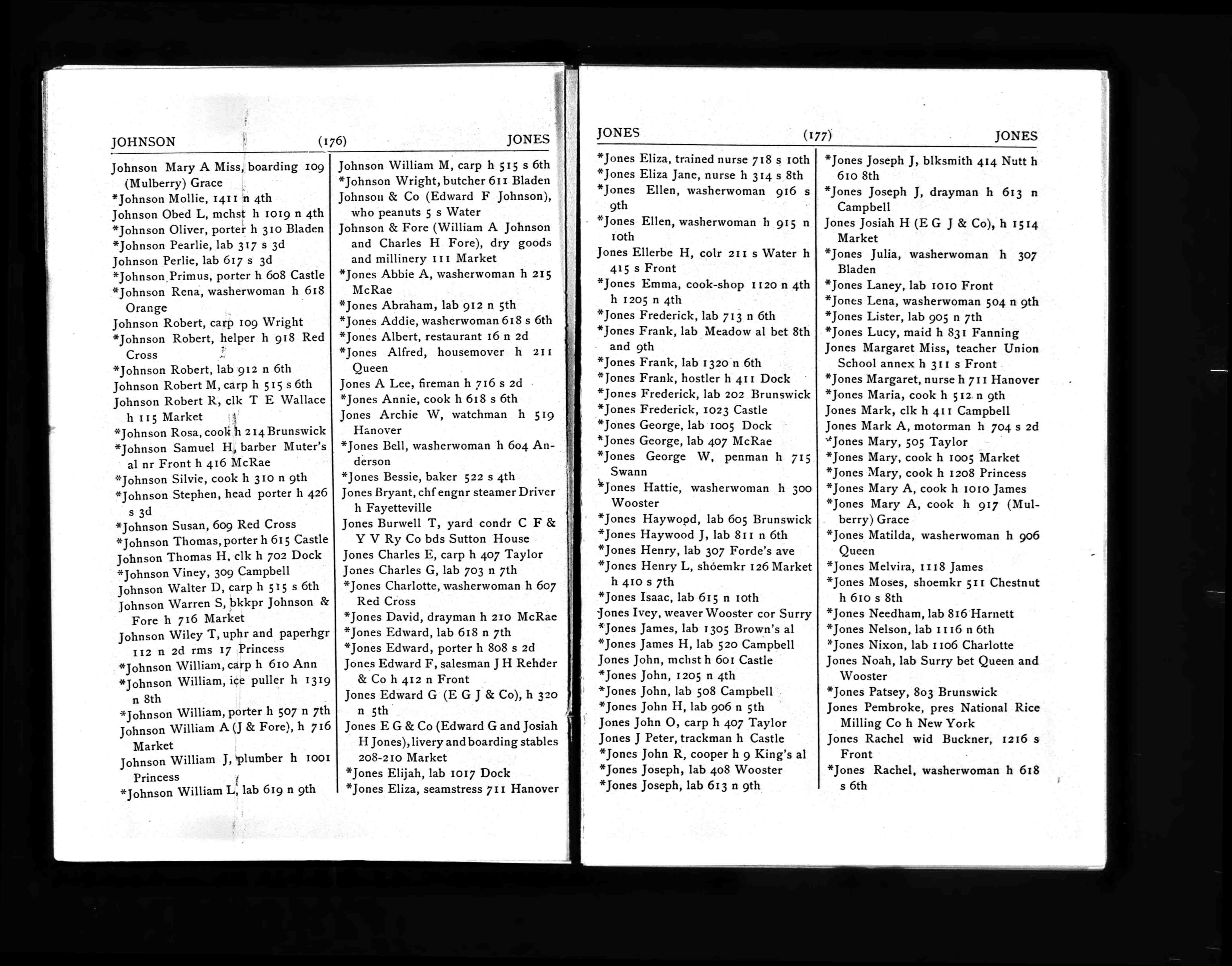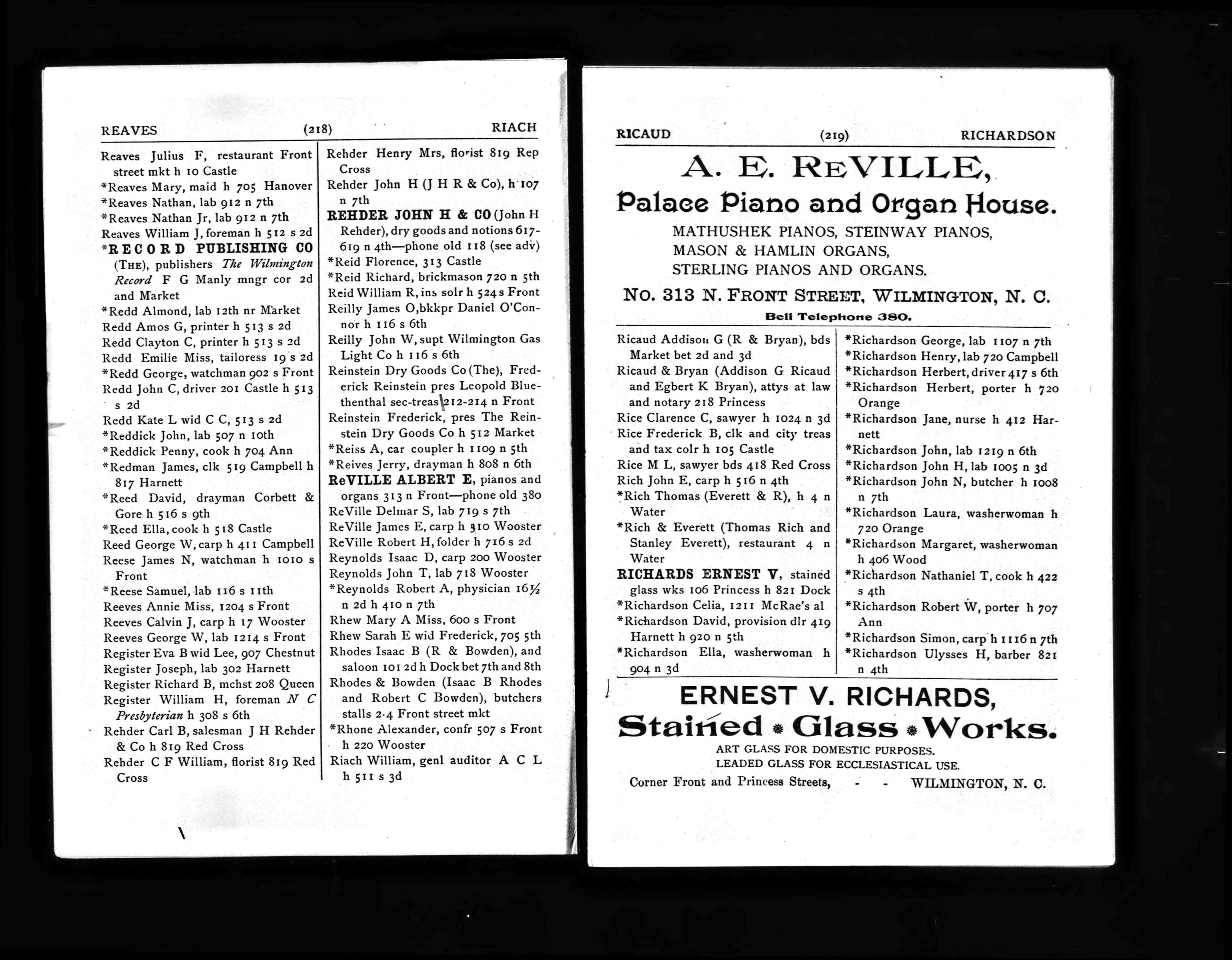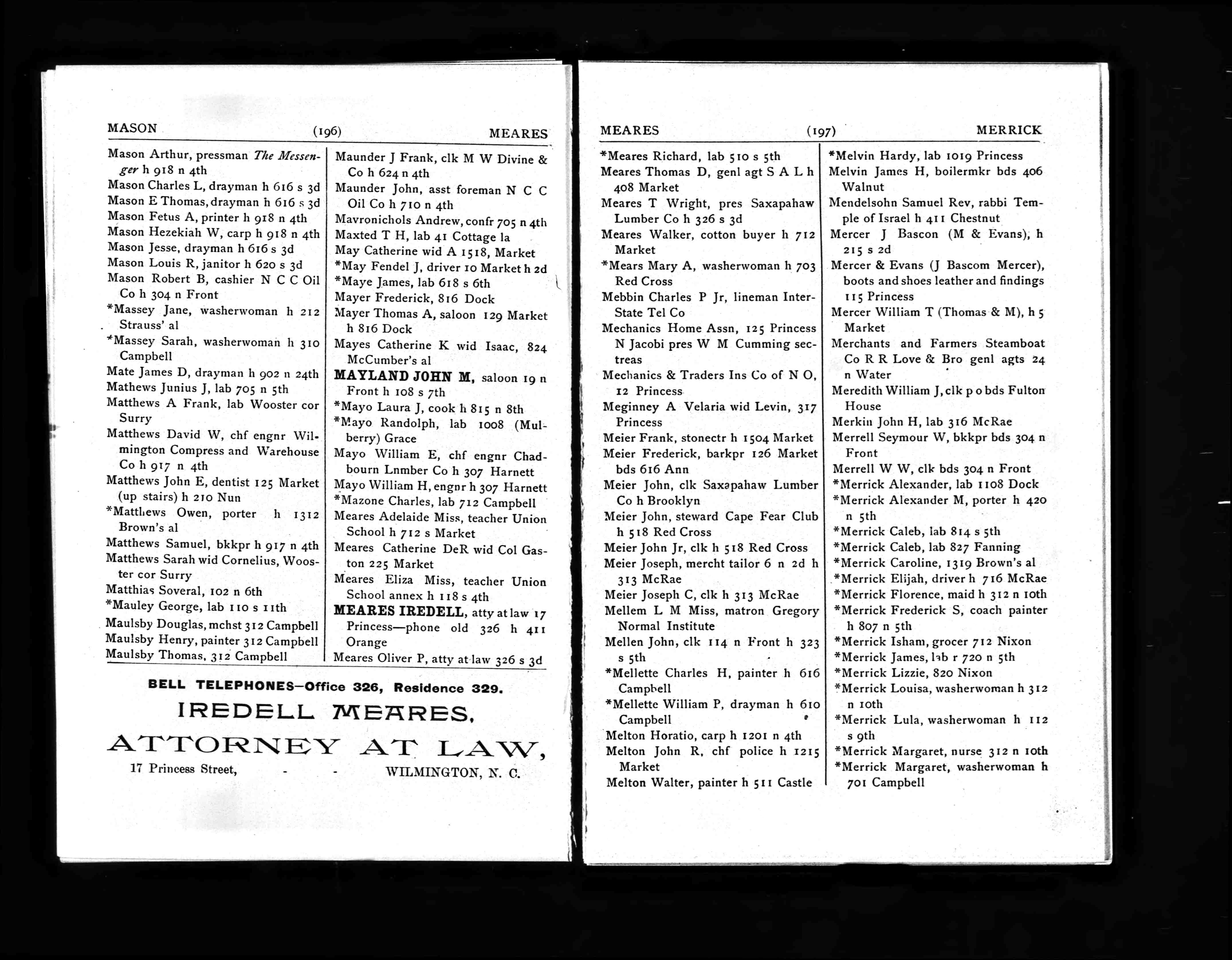 146 Ennett - Farrar 148 Farrell - Foster 150 Foster - Fuller 152 Fuller - Gaylord 154 Geams - Gore 156 Gore - Grier 158 Grier - Hall 160 Hall - Hanover 162 Hanscom - Hawes 164 Hawes - Herring 166 Herring - Hodges 168 Hodges - Howard 170 Howard - Humphrey 172 Humphrey - Jacobs 174 Jacobs - Johnson 176 Johnson - Jones 178 Jones - Kenan 180 Kendall - Koonce 182 Koonce - LeBoo 184 LeBoo - Litgen 186 Litgen - McCab 188 McCalister - McFarland 190 McFarland - McLaurin 192 McLaurine - MacKenzie 194 MacRae - Mask 196 Mason - Merrick 198 Merrick - Mitchell 200 Mitchell - Moore 202 Moore - Muller 204 Mumford - Neil 206 Neil - Nixon 208 Nobles - Ortmann 210 Ortmann - Pearsall 212 Pearsall - Pierce 214 Pierce - Prease 216 Prease - Reaves 218 Reaves - Richardson 220 Richardson - Robinson 222 Robinson - St James 224 St James - Schnibben 226 Schnibben - Shepard 228 Shepard - Skey 230 Skinner - Smith 232 Smith - Southerland 234 Southerland - Steljes 266 Steljes - Suggs 238 Suggs - Taylor 240 Taylor - Thorburn 242 Thorburn - Tyler 244 Tyler - Wade 246 Wade - Waters 248 Watrous - Wheeler 250 Wheeler - Willard 252 Willard - Williams 254 Williams - Wilmington 256 Wilson - Worth 258 Wortham - Young 260 Young - Zoeller Business Directory 261 Advertising Companies - Barbers 262 Barbers - Chemical Companies 264 China Decorators and Painters - Dressmakers 266 Dressmakers - Grocers 268 Grocers - Hatters 270 Hay, Grain and Feed Dealers - Lithographers 272 Livery Sale and Exchange Stables - Painters: Carriage 274 Painters: House and Sign - Saloons 276 Saloons - Wood Dealers 286 advertisements 287 advertisements |