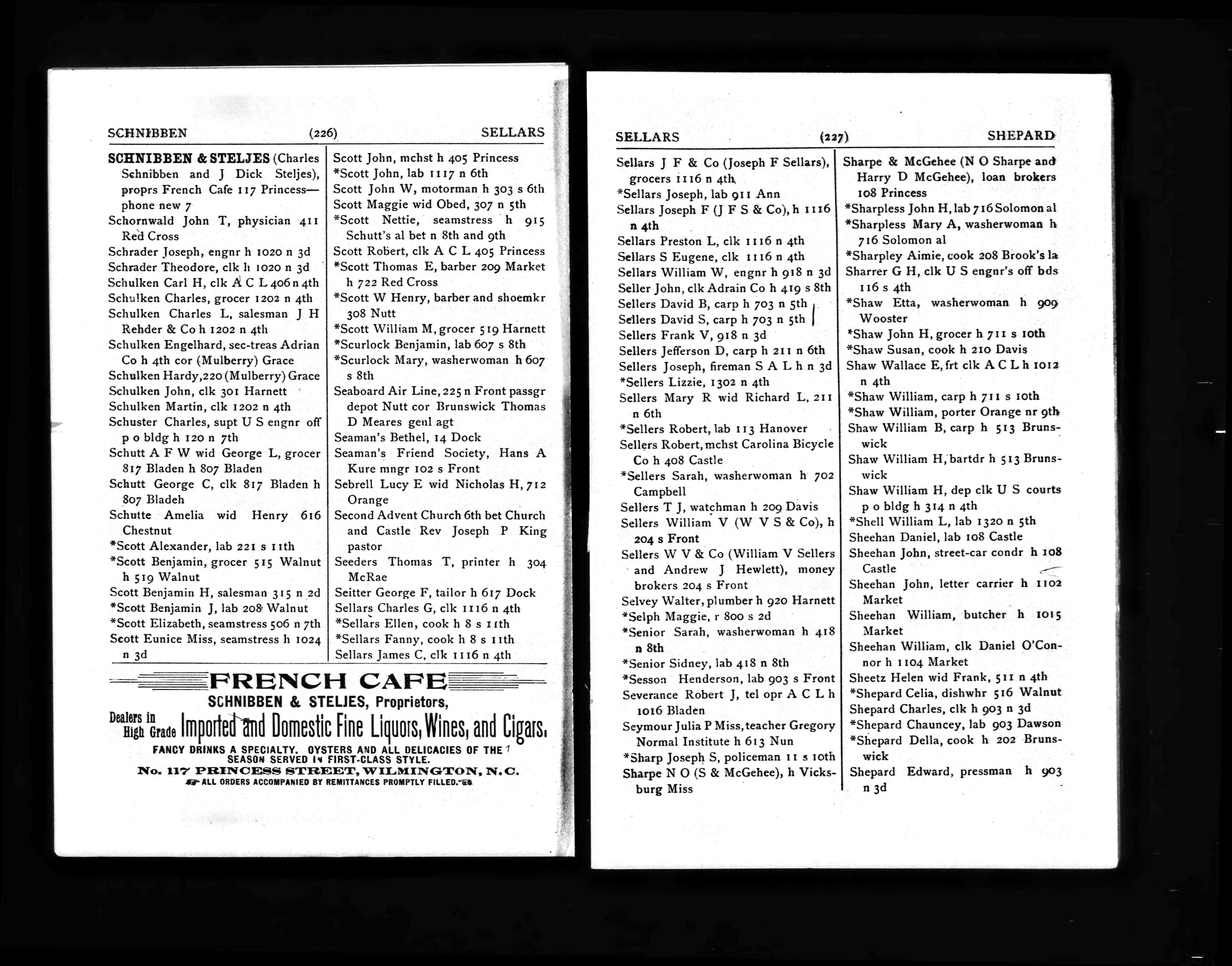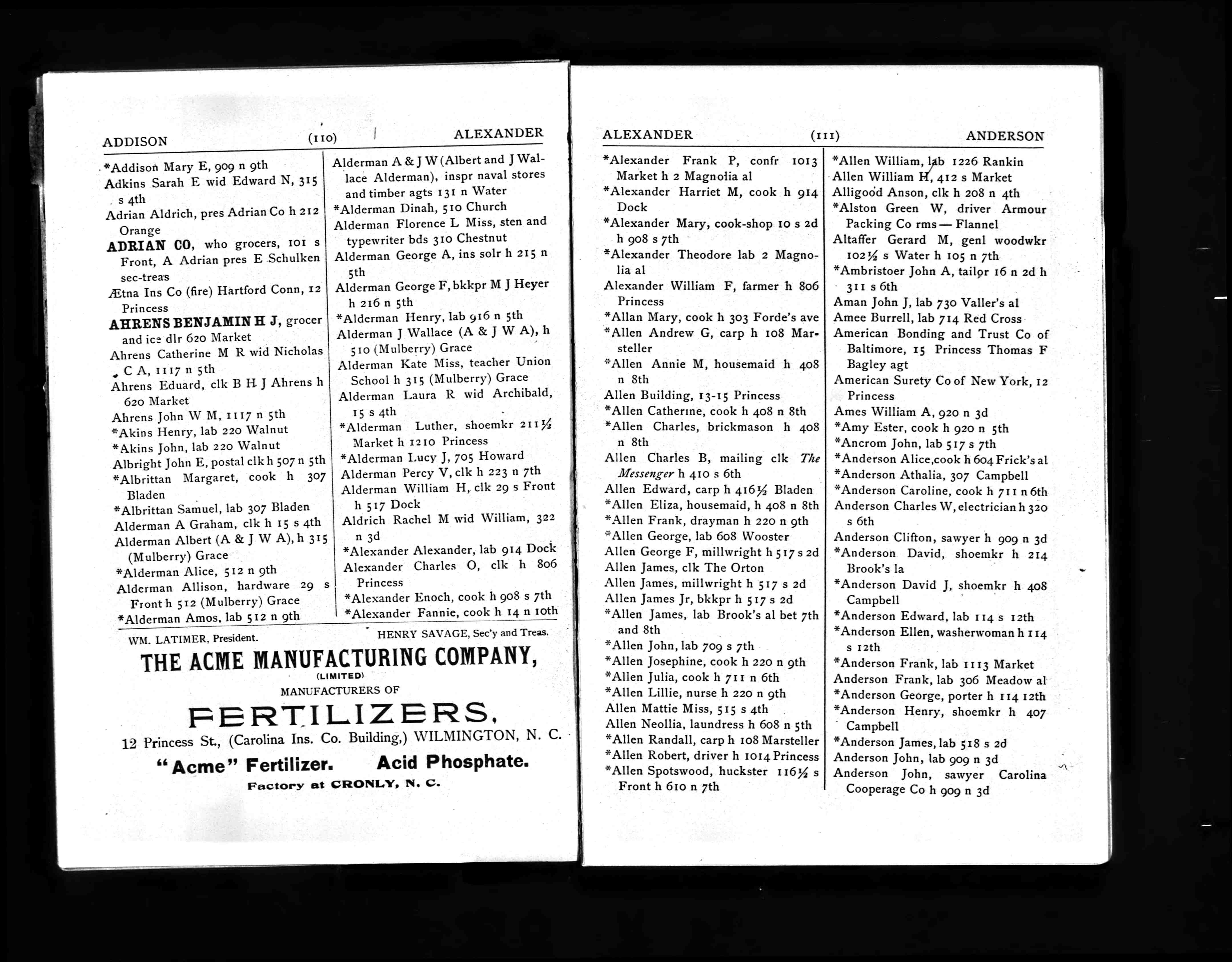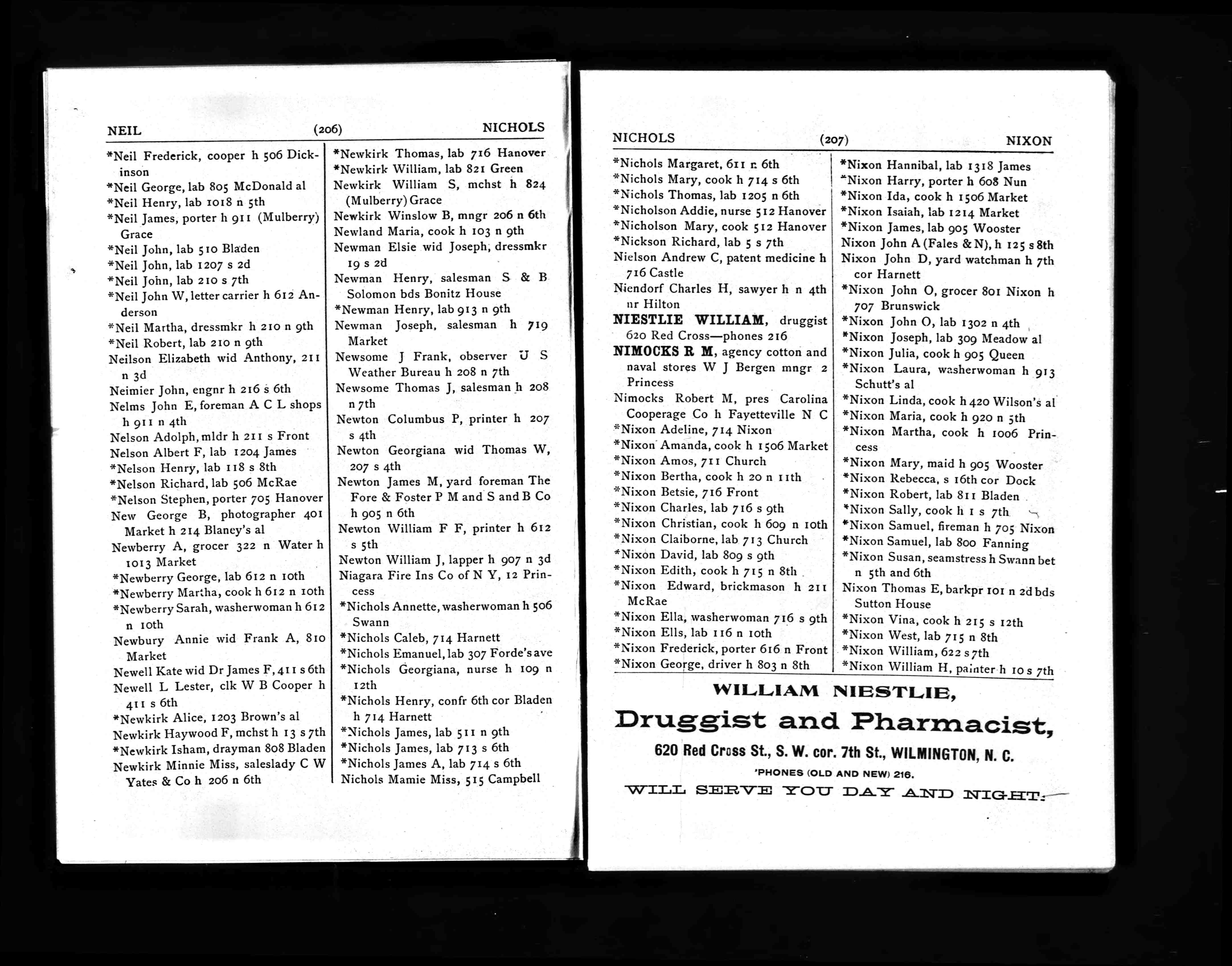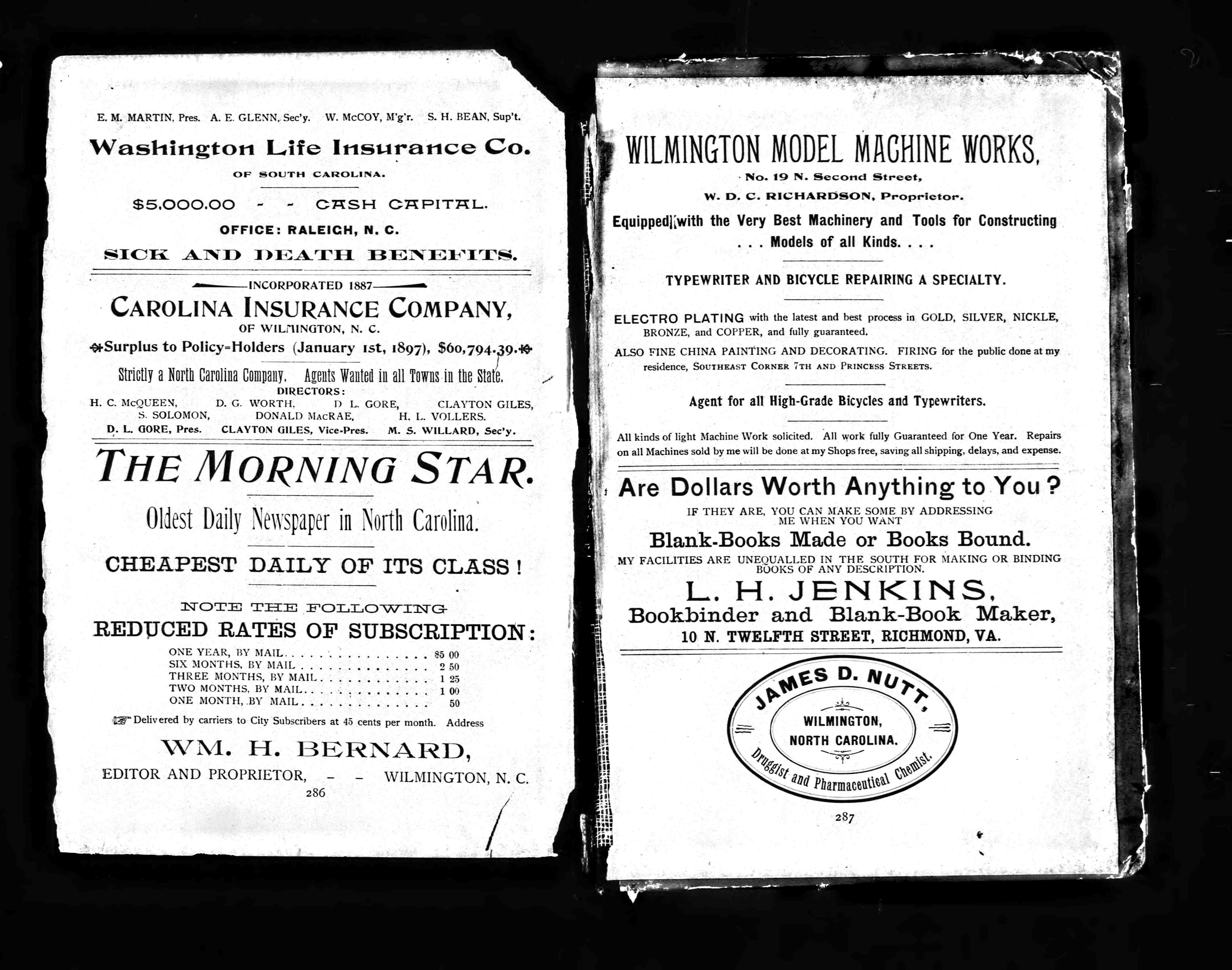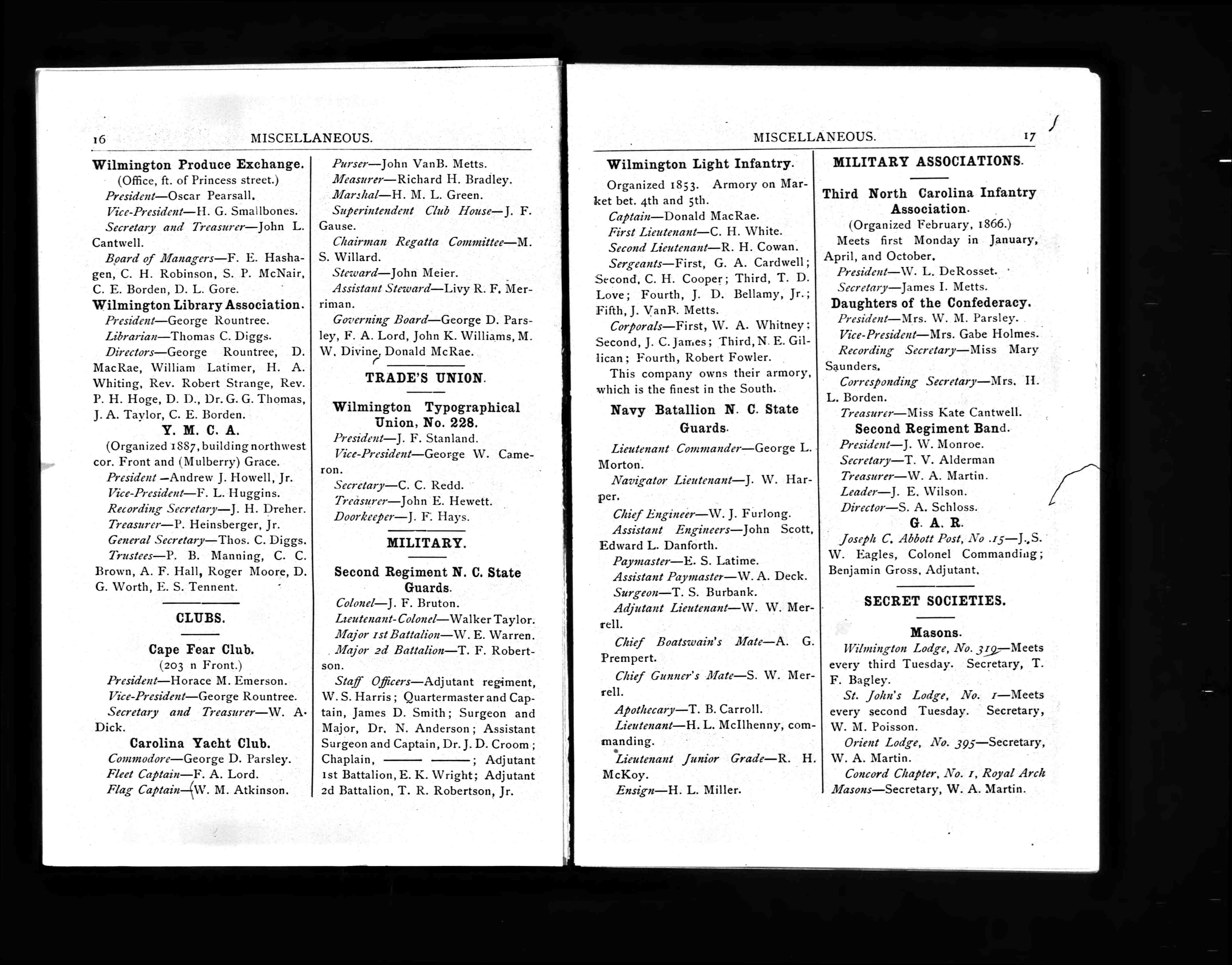 146 Ennett - Farrar 148 Farrell - Foster 150 Foster - Fuller 152 Fuller - Gaylord 154 Geams - Gore 156 Gore - Grier 158 Grier - Hall 160 Hall - Hanover 162 Hanscom - Hawes 164 Hawes - Herring 166 Herring - Hodges 168 Hodges - Howard 170 Howard - Humphrey 172 Humphrey - Jacobs 174 Jacobs - Johnson 176 Johnson - Jones 178 Jones - Kenan 180 Kendall - Koonce 182 Koonce - LeBoo 184 LeBoo - Litgen 186 Litgen - McCab 188 McCalister - McFarland 190 McFarland - McLaurin 192 McLaurine - MacKenzie 194 MacRae - Mask 196 Mason - Merrick 198 Merrick - Mitchell 200 Mitchell - Moore 202 Moore - Muller 204 Mumford - Neil 206 Neil - Nixon 208 Nobles - Ortmann 210 Ortmann - Pearsall 212 Pearsall - Pierce 214 Pierce - Prease 216 Prease - Reaves 218 Reaves - Richardson 220 Richardson - Robinson 222 Robinson - St James 224 St James - Schnibben 226 Schnibben - Shepard 228 Shepard - Skey 230 Skinner - Smith 232 Smith - Southerland 234 Southerland - Steljes 266 Steljes - Suggs 238 Suggs - Taylor 240 Taylor - Thorburn 242 Thorburn - Tyler 244 Tyler - Wade 246 Wade - Waters 248 Watrous - Wheeler 250 Wheeler - Willard 252 Willard - Williams 254 Williams - Wilmington 256 Wilson - Worth 258 Wortham - Young 260 Young - Zoeller Business Directory 261 Advertising Companies - Barbers 262 Barbers - Chemical Companies 264 China Decorators and Painters - Dressmakers 266 Dressmakers - Grocers 268 Grocers - Hatters 270 Hay, Grain and Feed Dealers - Lithographers 272 Livery Sale and Exchange Stables - Painters: Carriage 274 Painters: House and Sign - Saloons 276 Saloons - Wood Dealers 286 advertisements 287 advertisements |