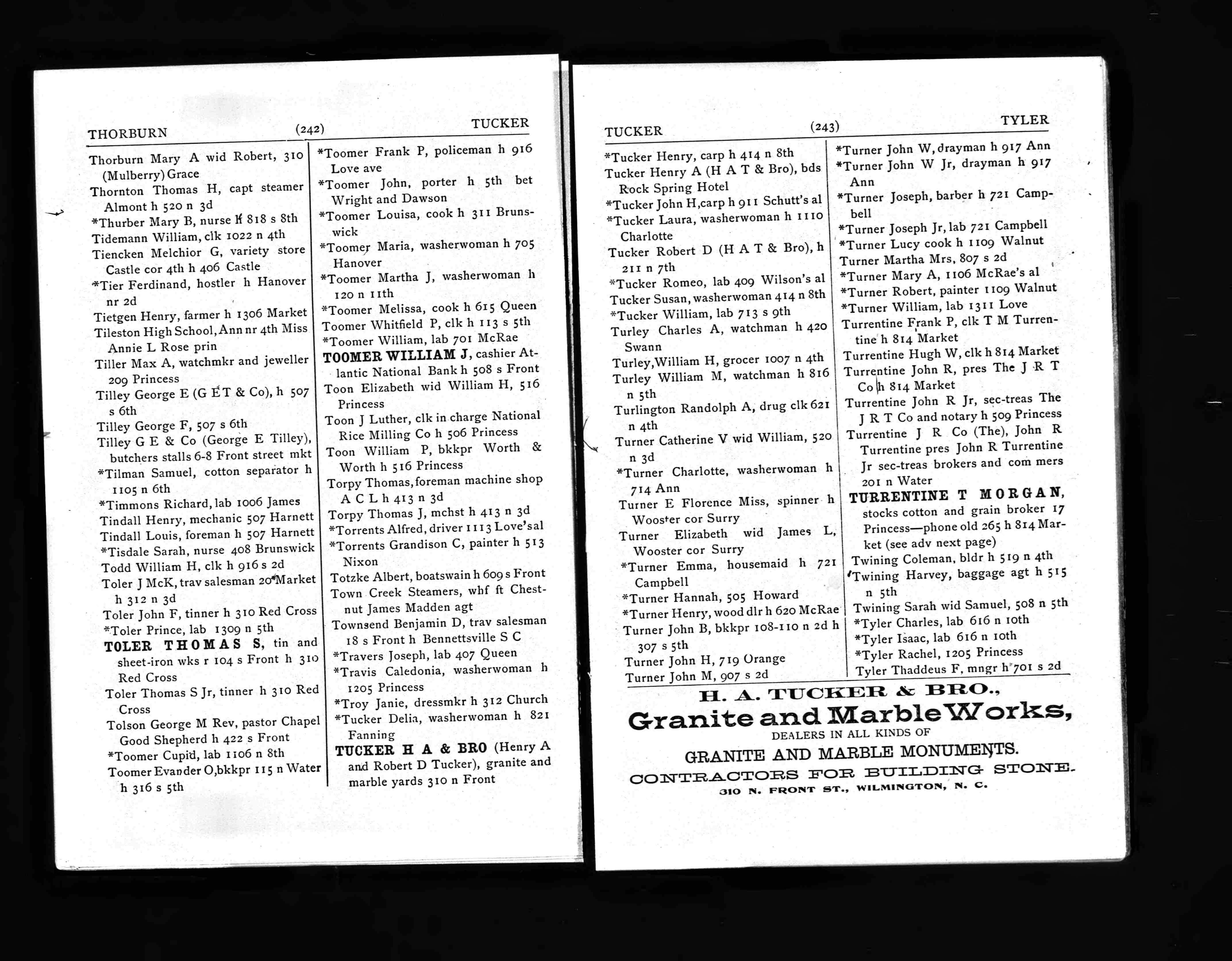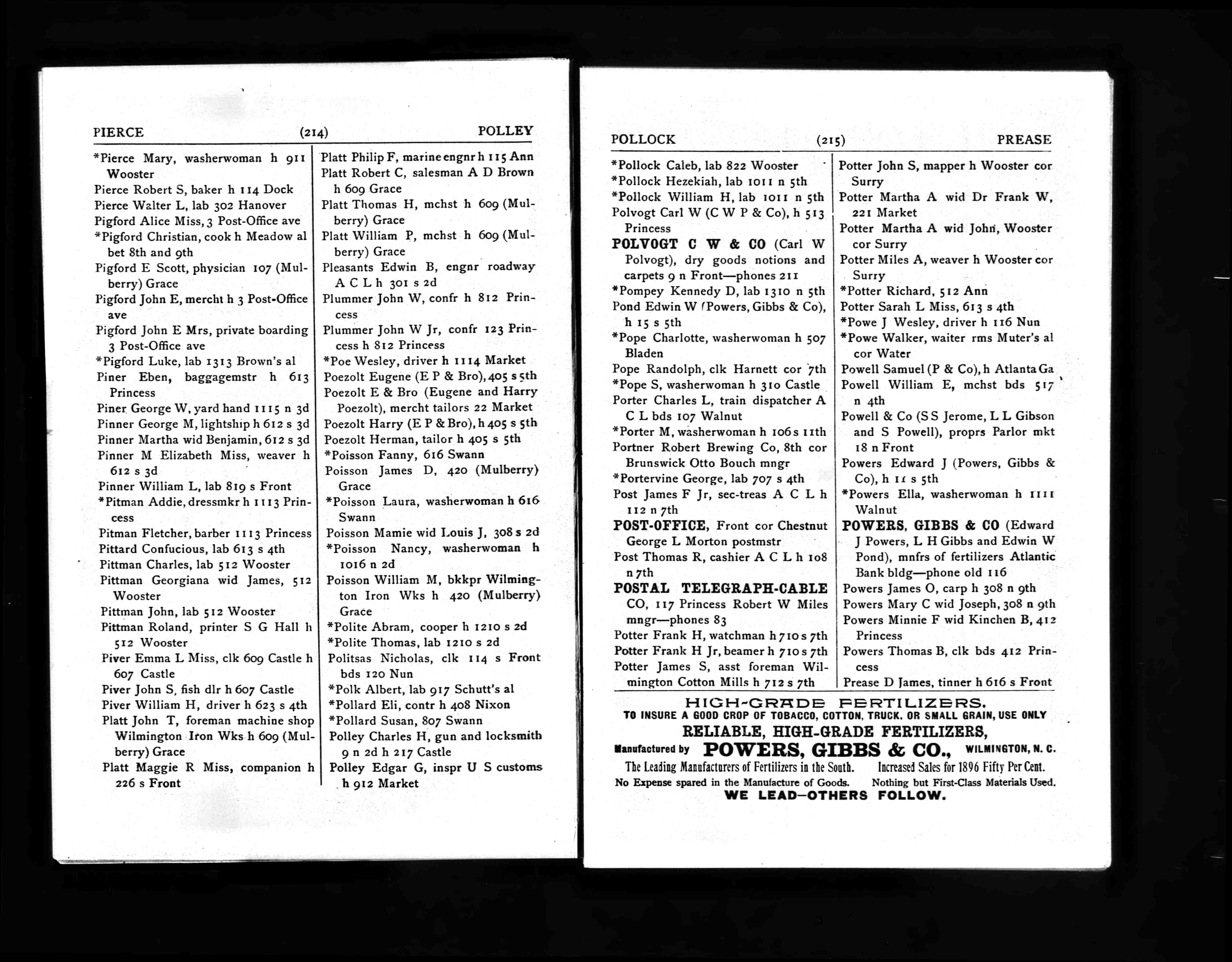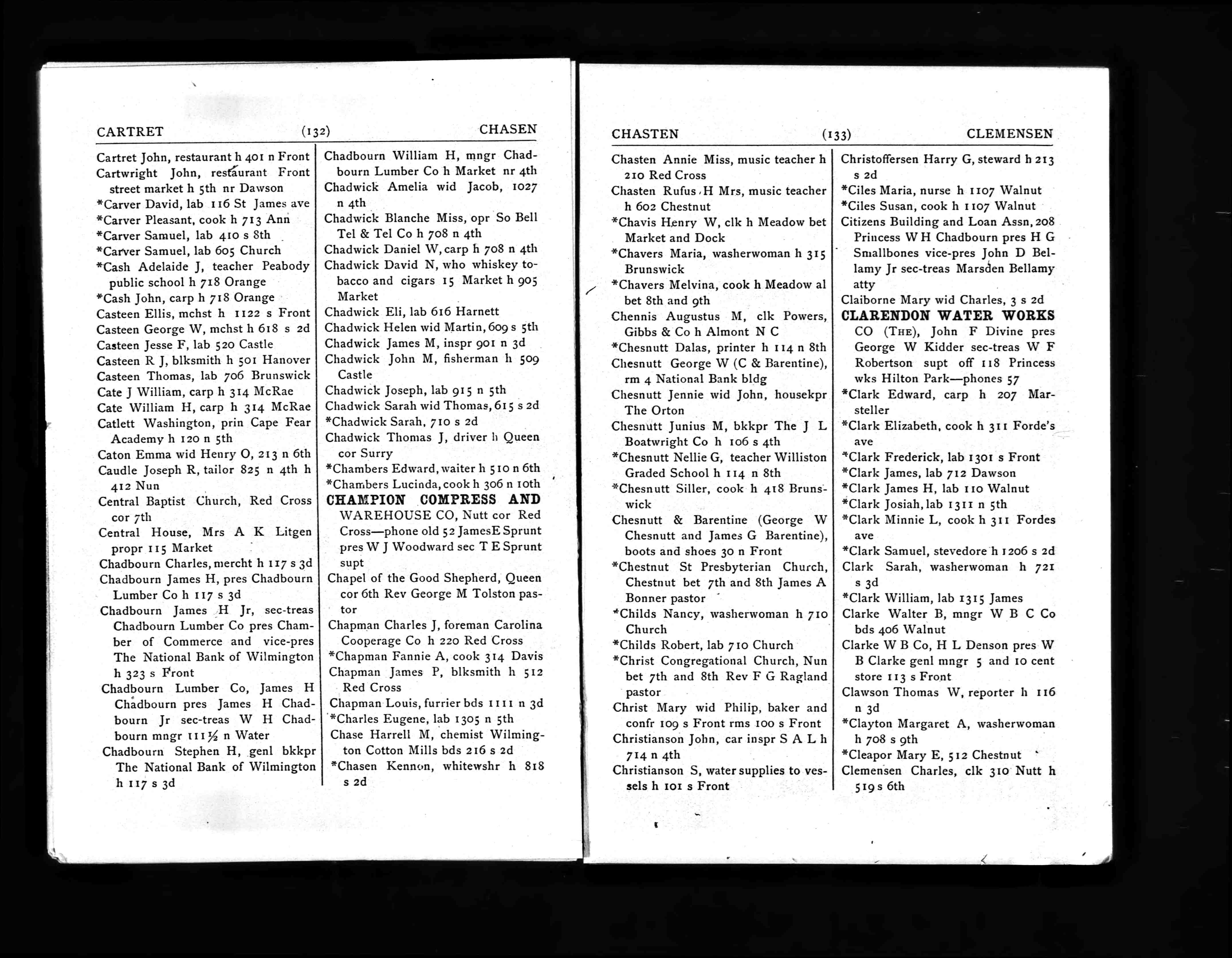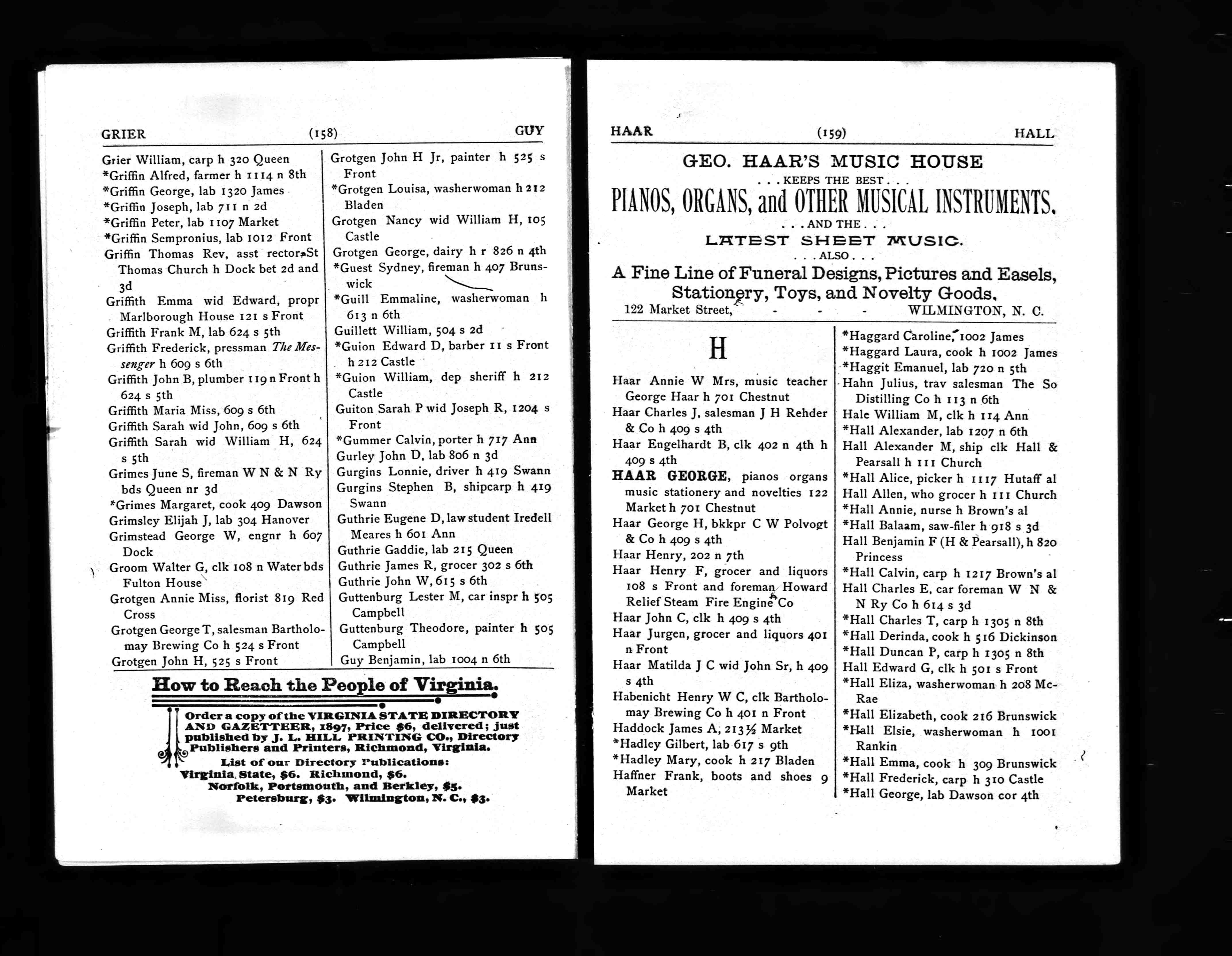 146 Ennett - Farrar 148 Farrell - Foster 150 Foster - Fuller 152 Fuller - Gaylord 154 Geams - Gore 156 Gore - Grier 158 Grier - Hall 160 Hall - Hanover 162 Hanscom - Hawes 164 Hawes - Herring 166 Herring - Hodges 168 Hodges - Howard 170 Howard - Humphrey 172 Humphrey - Jacobs 174 Jacobs - Johnson 176 Johnson - Jones 178 Jones - Kenan 180 Kendall - Koonce 182 Koonce - LeBoo 184 LeBoo - Litgen 186 Litgen - McCab 188 McCalister - McFarland 190 McFarland - McLaurin 192 McLaurine - MacKenzie 194 MacRae - Mask 196 Mason - Merrick 198 Merrick - Mitchell 200 Mitchell - Moore 202 Moore - Muller 204 Mumford - Neil 206 Neil - Nixon 208 Nobles - Ortmann 210 Ortmann - Pearsall 212 Pearsall - Pierce 214 Pierce - Prease 216 Prease - Reaves 218 Reaves - Richardson 220 Richardson - Robinson 222 Robinson - St James 224 St James - Schnibben 226 Schnibben - Shepard 228 Shepard - Skey 230 Skinner - Smith 232 Smith - Southerland 234 Southerland - Steljes 266 Steljes - Suggs 238 Suggs - Taylor 240 Taylor - Thorburn 242 Thorburn - Tyler 244 Tyler - Wade 246 Wade - Waters 248 Watrous - Wheeler 250 Wheeler - Willard 252 Willard - Williams 254 Williams - Wilmington 256 Wilson - Worth 258 Wortham - Young 260 Young - Zoeller Business Directory 261 Advertising Companies - Barbers 262 Barbers - Chemical Companies 264 China Decorators and Painters - Dressmakers 266 Dressmakers - Grocers 268 Grocers - Hatters 270 Hay, Grain and Feed Dealers - Lithographers 272 Livery Sale and Exchange Stables - Painters: Carriage 274 Painters: House and Sign - Saloons 276 Saloons - Wood Dealers 286 advertisements 287 advertisements |