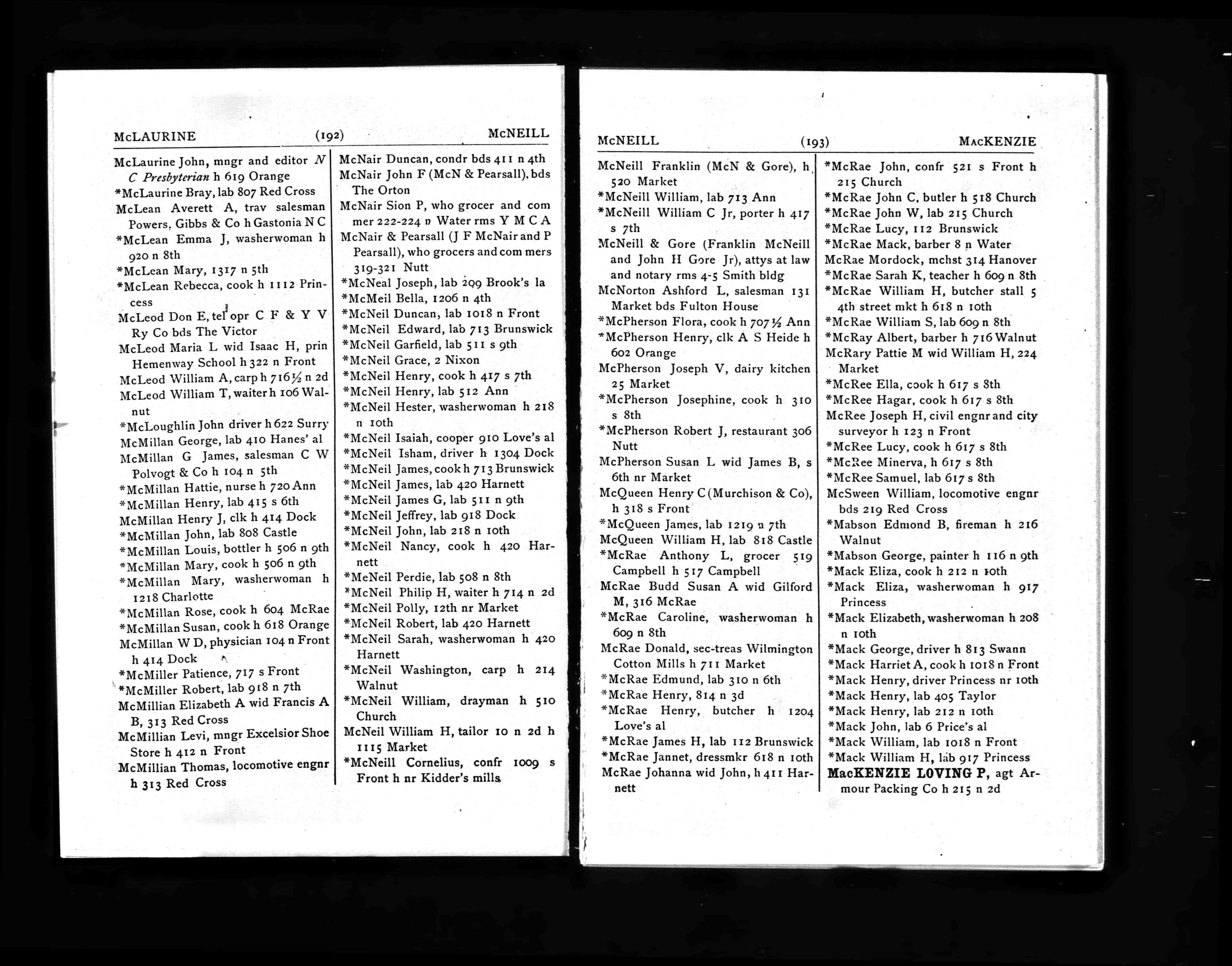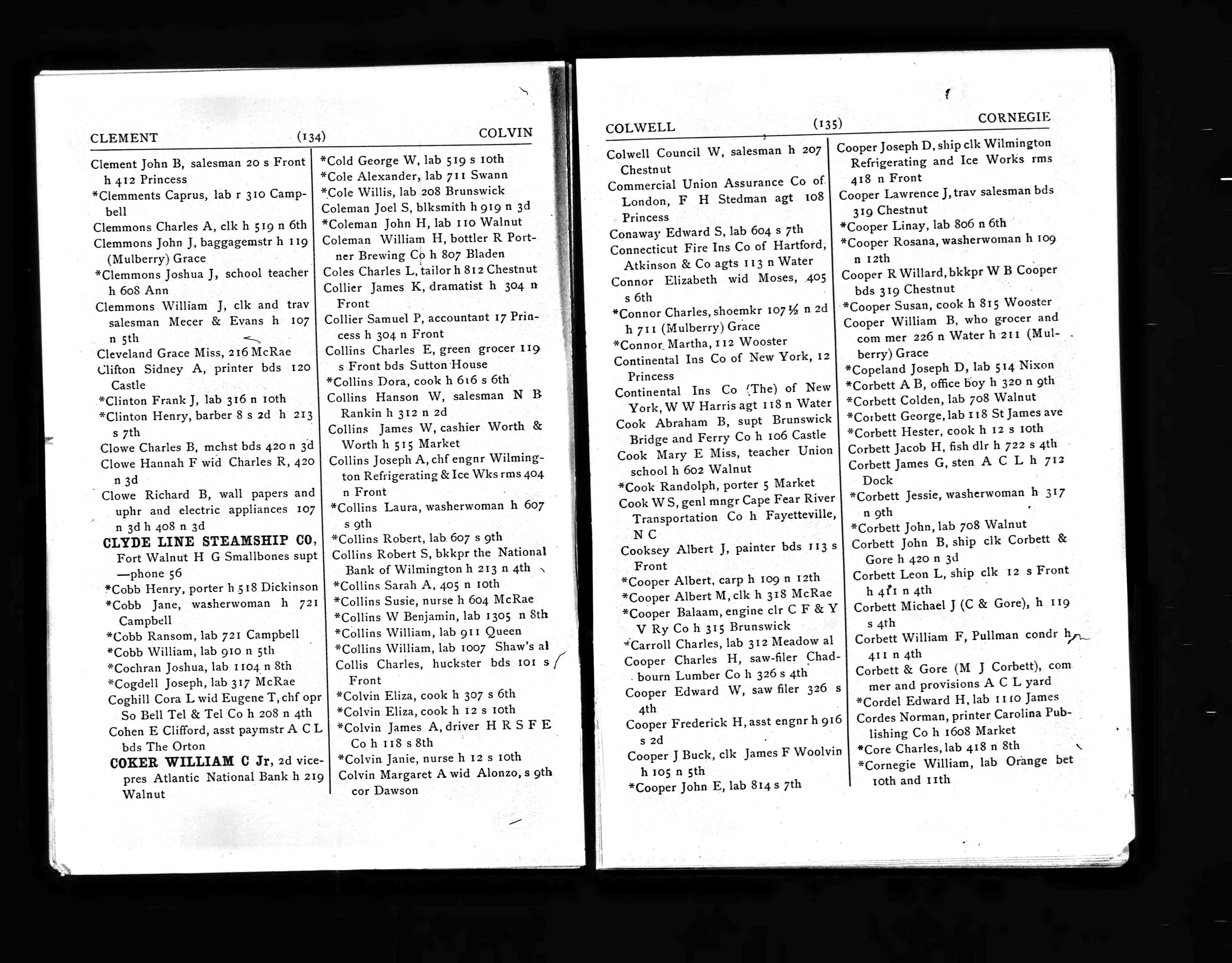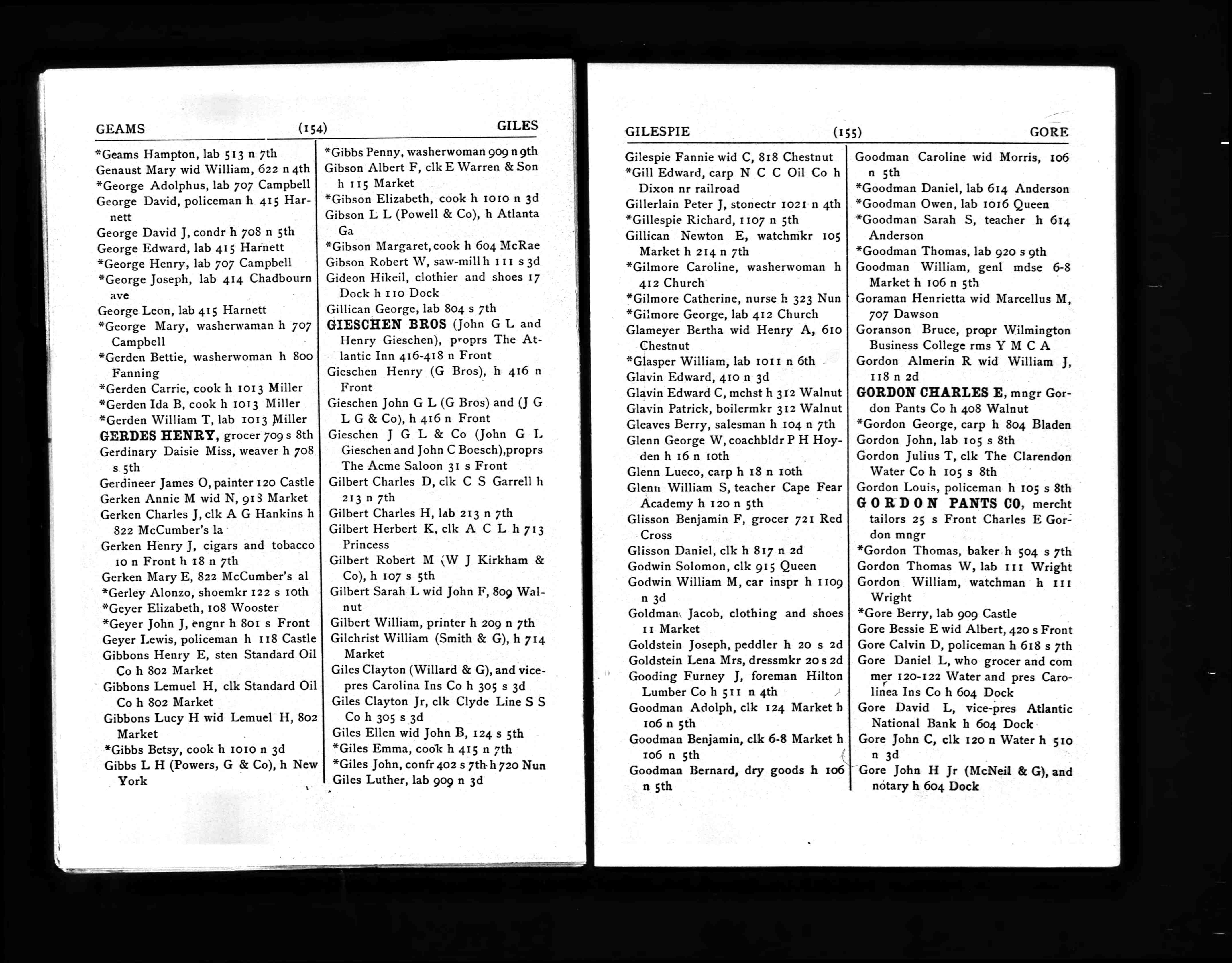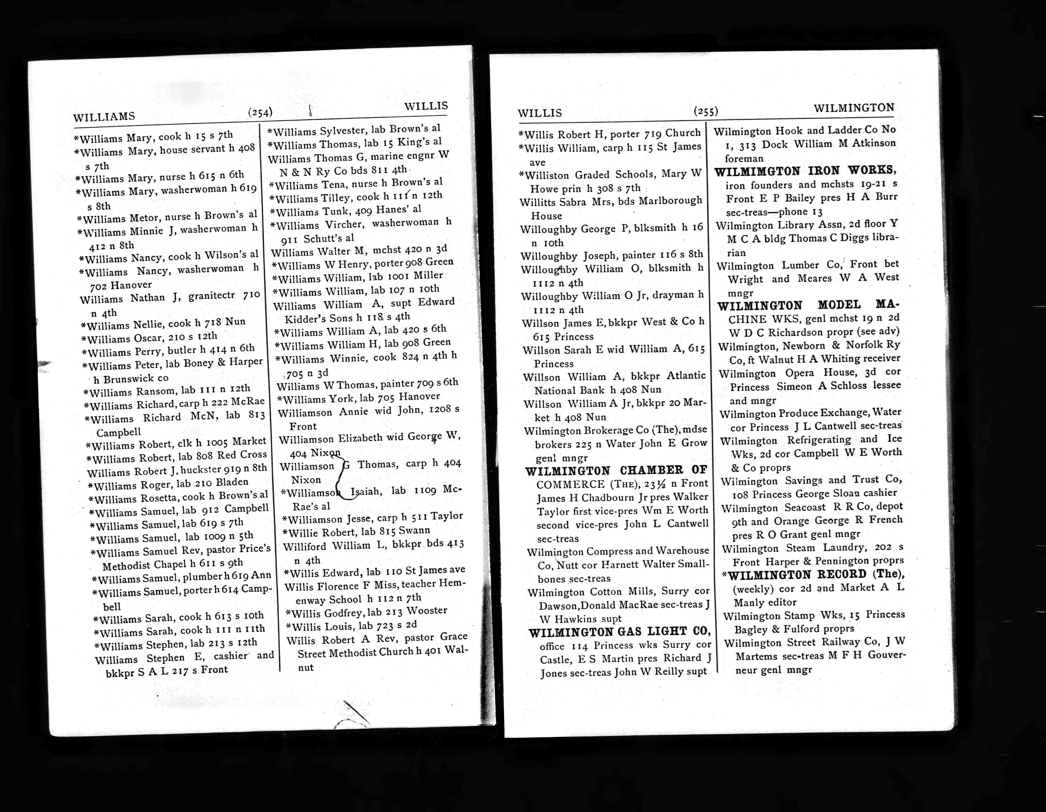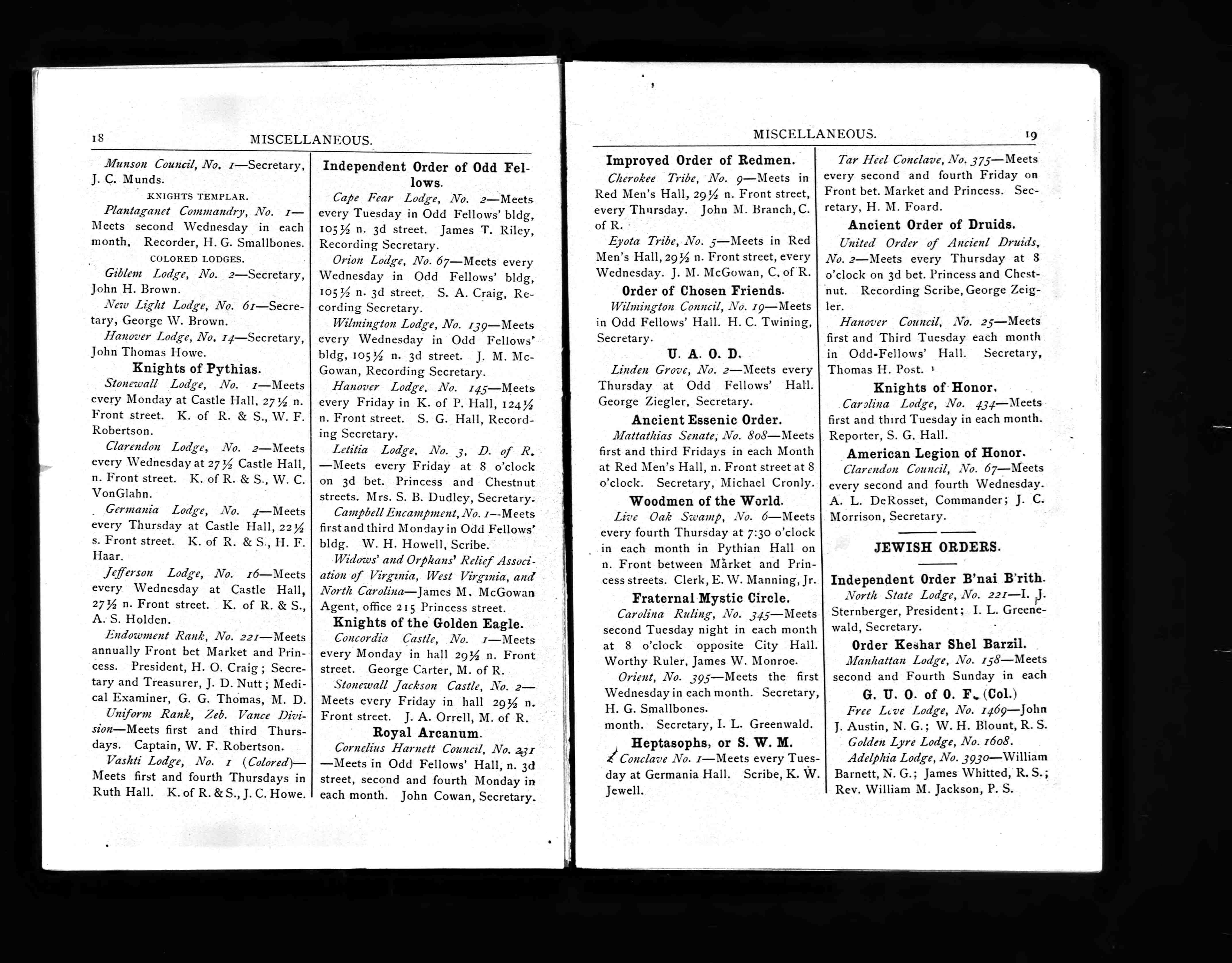 146 Ennett - Farrar 148 Farrell - Foster 150 Foster - Fuller 152 Fuller - Gaylord 154 Geams - Gore 156 Gore - Grier 158 Grier - Hall 160 Hall - Hanover 162 Hanscom - Hawes 164 Hawes - Herring 166 Herring - Hodges 168 Hodges - Howard 170 Howard - Humphrey 172 Humphrey - Jacobs 174 Jacobs - Johnson 176 Johnson - Jones 178 Jones - Kenan 180 Kendall - Koonce 182 Koonce - LeBoo 184 LeBoo - Litgen 186 Litgen - McCab 188 McCalister - McFarland 190 McFarland - McLaurin 192 McLaurine - MacKenzie 194 MacRae - Mask 196 Mason - Merrick 198 Merrick - Mitchell 200 Mitchell - Moore 202 Moore - Muller 204 Mumford - Neil 206 Neil - Nixon 208 Nobles - Ortmann 210 Ortmann - Pearsall 212 Pearsall - Pierce 214 Pierce - Prease 216 Prease - Reaves 218 Reaves - Richardson 220 Richardson - Robinson 222 Robinson - St James 224 St James - Schnibben 226 Schnibben - Shepard 228 Shepard - Skey 230 Skinner - Smith 232 Smith - Southerland 234 Southerland - Steljes 266 Steljes - Suggs 238 Suggs - Taylor 240 Taylor - Thorburn 242 Thorburn - Tyler 244 Tyler - Wade 246 Wade - Waters 248 Watrous - Wheeler 250 Wheeler - Willard 252 Willard - Williams 254 Williams - Wilmington 256 Wilson - Worth 258 Wortham - Young 260 Young - Zoeller Business Directory 261 Advertising Companies - Barbers 262 Barbers - Chemical Companies 264 China Decorators and Painters - Dressmakers 266 Dressmakers - Grocers 268 Grocers - Hatters 270 Hay, Grain and Feed Dealers - Lithographers 272 Livery Sale and Exchange Stables - Painters: Carriage 274 Painters: House and Sign - Saloons 276 Saloons - Wood Dealers 286 advertisements 287 advertisements |