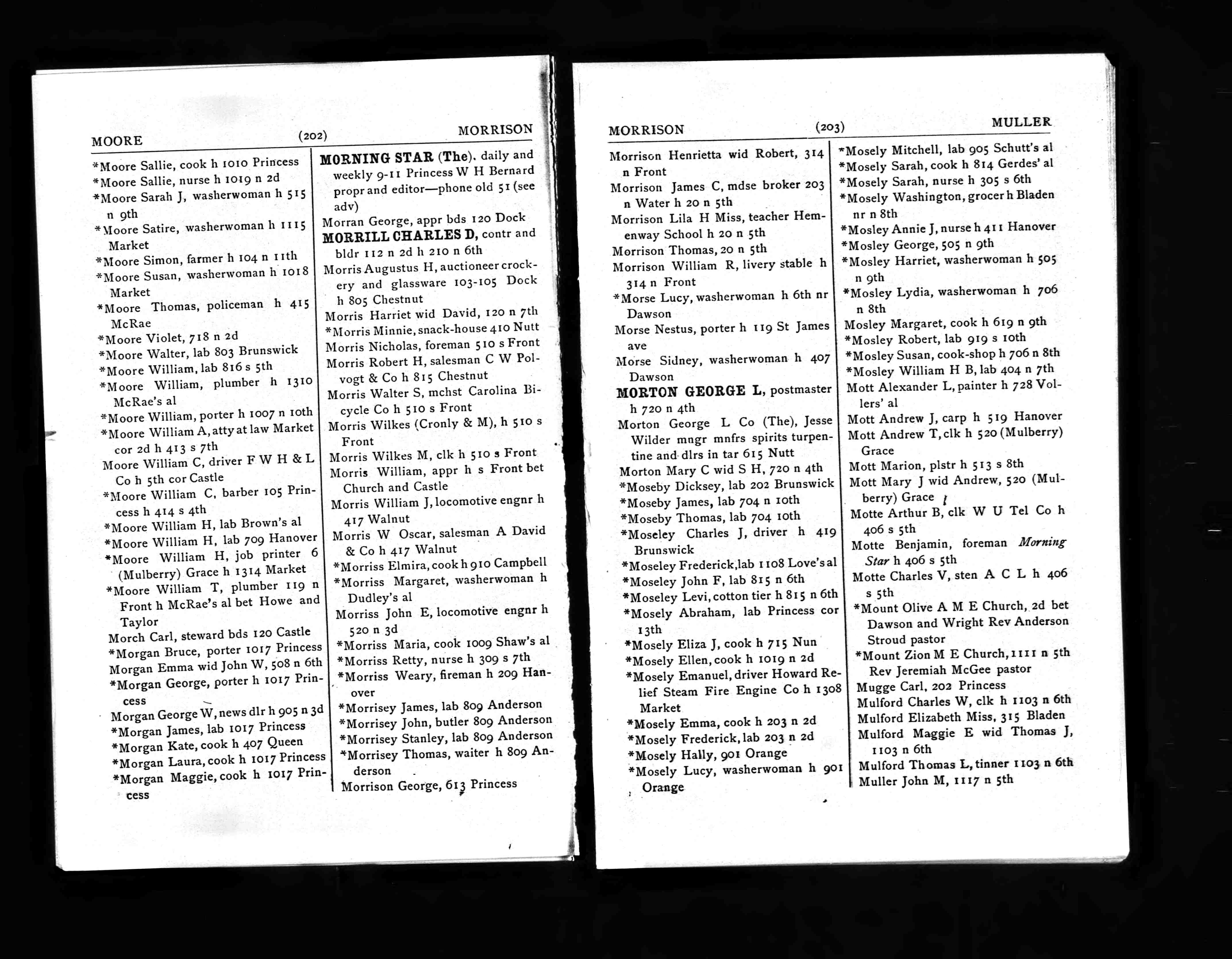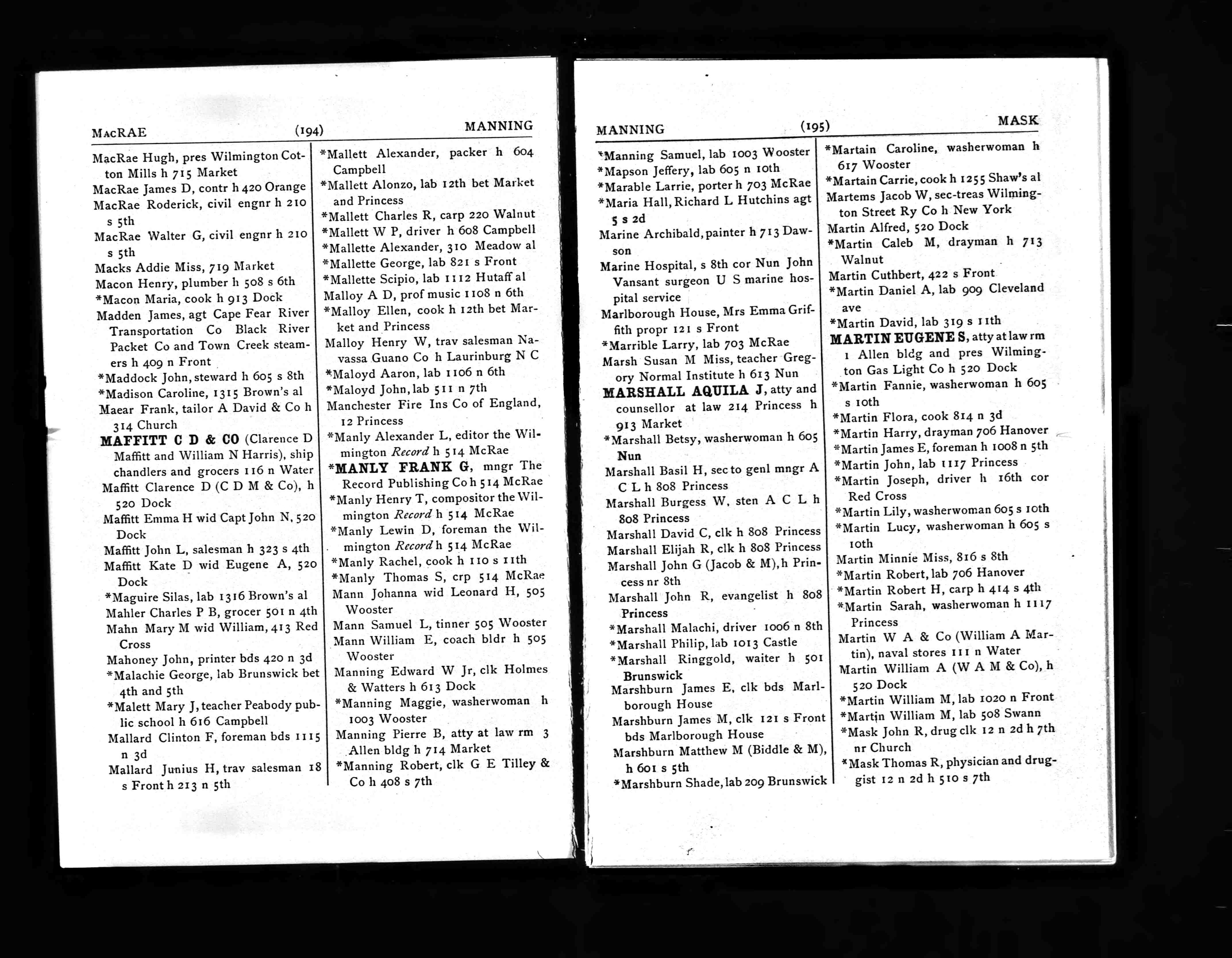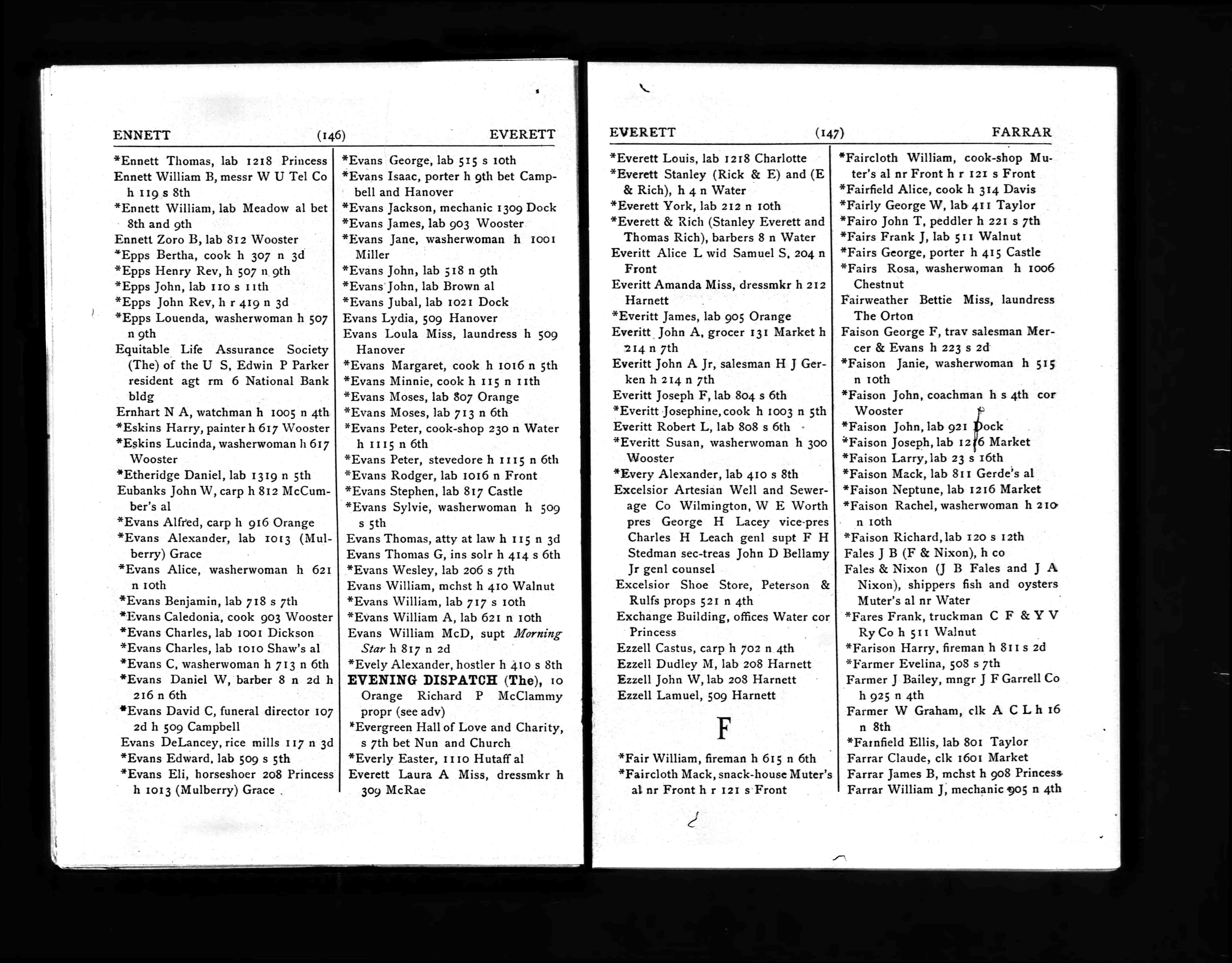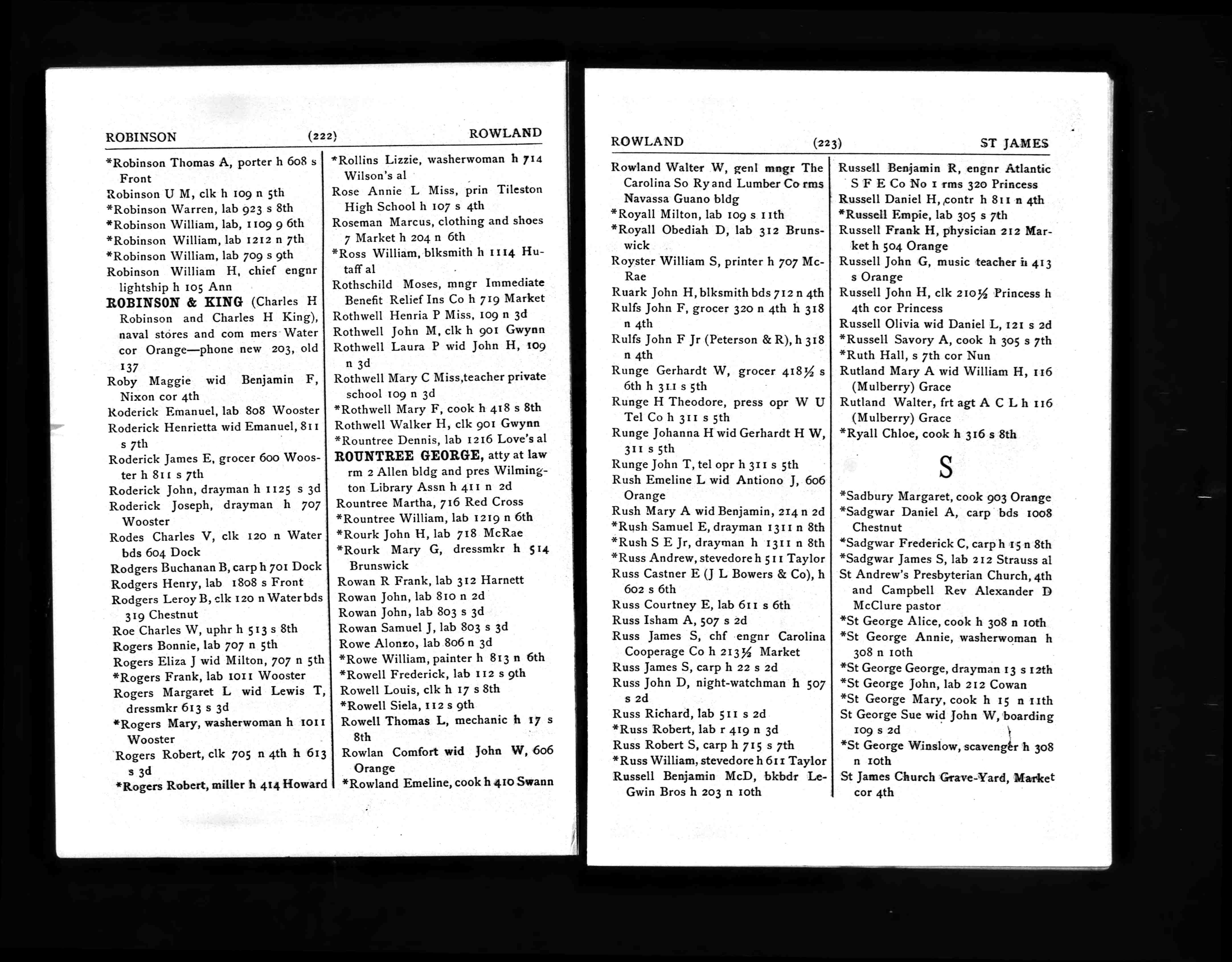 146 Ennett - Farrar 148 Farrell - Foster 150 Foster - Fuller 152 Fuller - Gaylord 154 Geams - Gore 156 Gore - Grier 158 Grier - Hall 160 Hall - Hanover 162 Hanscom - Hawes 164 Hawes - Herring 166 Herring - Hodges 168 Hodges - Howard 170 Howard - Humphrey 172 Humphrey - Jacobs 174 Jacobs - Johnson 176 Johnson - Jones 178 Jones - Kenan 180 Kendall - Koonce 182 Koonce - LeBoo 184 LeBoo - Litgen 186 Litgen - McCab 188 McCalister - McFarland 190 McFarland - McLaurin 192 McLaurine - MacKenzie 194 MacRae - Mask 196 Mason - Merrick 198 Merrick - Mitchell 200 Mitchell - Moore 202 Moore - Muller 204 Mumford - Neil 206 Neil - Nixon 208 Nobles - Ortmann 210 Ortmann - Pearsall 212 Pearsall - Pierce 214 Pierce - Prease 216 Prease - Reaves 218 Reaves - Richardson 220 Richardson - Robinson 222 Robinson - St James 224 St James - Schnibben 226 Schnibben - Shepard 228 Shepard - Skey 230 Skinner - Smith 232 Smith - Southerland 234 Southerland - Steljes 266 Steljes - Suggs 238 Suggs - Taylor 240 Taylor - Thorburn 242 Thorburn - Tyler 244 Tyler - Wade 246 Wade - Waters 248 Watrous - Wheeler 250 Wheeler - Willard 252 Willard - Williams 254 Williams - Wilmington 256 Wilson - Worth 258 Wortham - Young 260 Young - Zoeller Business Directory 261 Advertising Companies - Barbers 262 Barbers - Chemical Companies 264 China Decorators and Painters - Dressmakers 266 Dressmakers - Grocers 268 Grocers - Hatters 270 Hay, Grain and Feed Dealers - Lithographers 272 Livery Sale and Exchange Stables - Painters: Carriage 274 Painters: House and Sign - Saloons 276 Saloons - Wood Dealers 286 advertisements 287 advertisements |