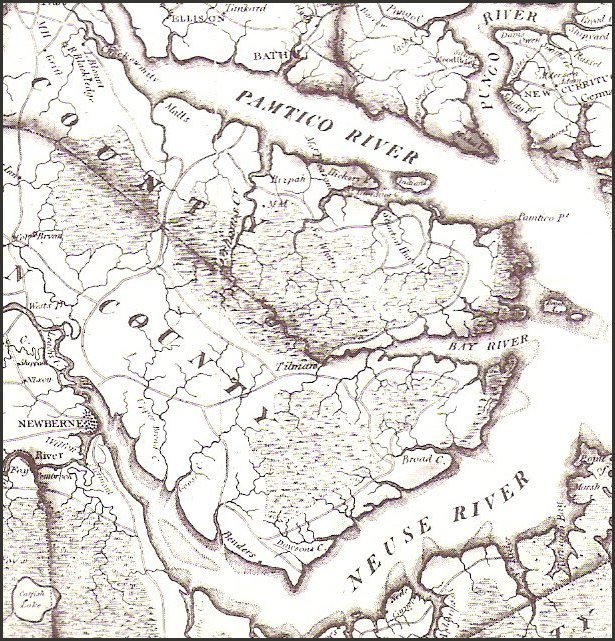 This 1808 Price-Strothers map showing here the area between the Pamtico River and the Neuse River which became Pamlico County in 1872.