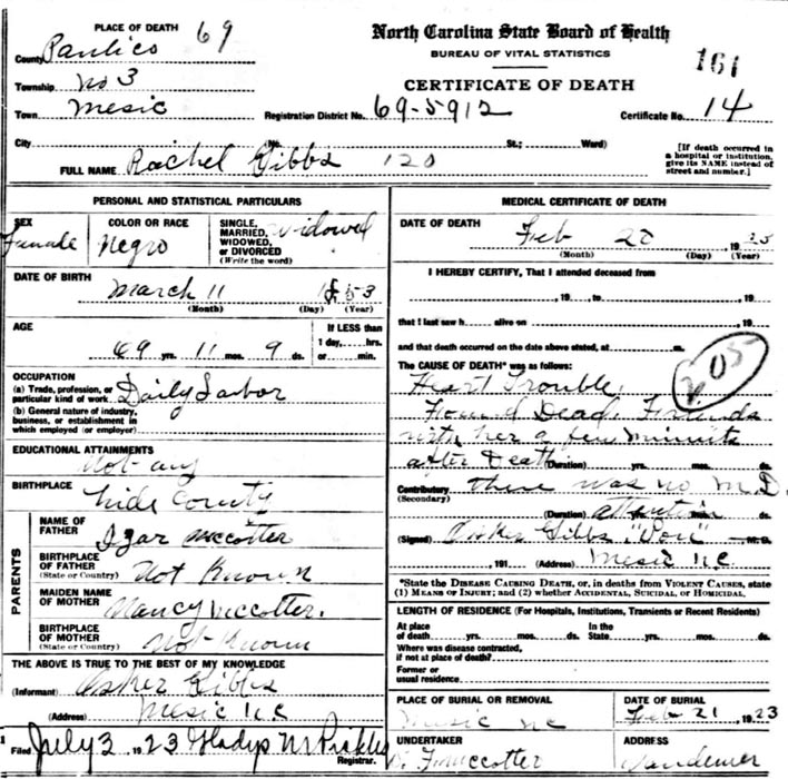 | Gibbs, Rachael | b | f | 27 | wife | m | Keeps house | NC | NC | NC | Death Certificate | |||