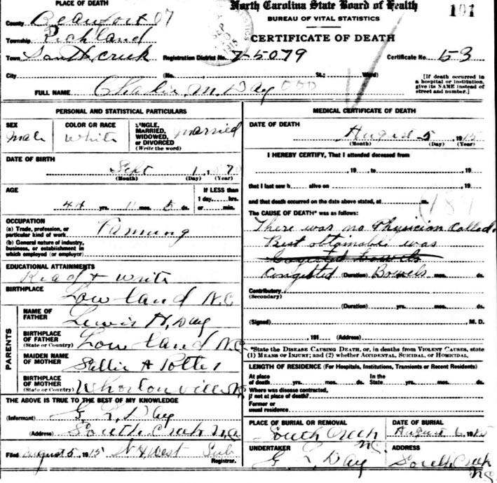 | Day, Charlie M. | w | m | 9 | son | s | NC | NC | NC | Death Certificate | ||||