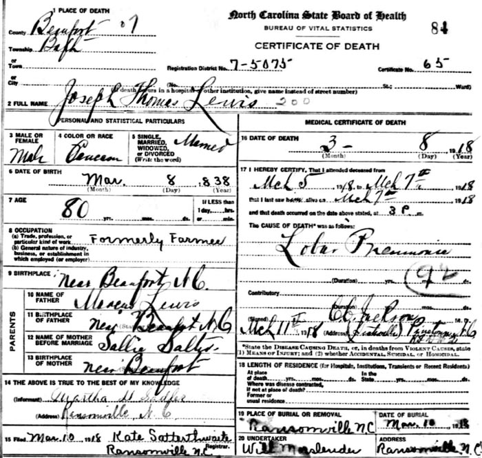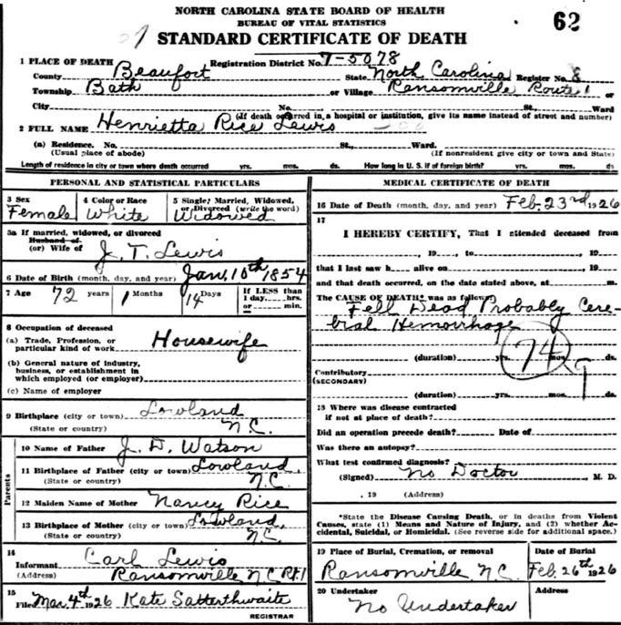 | Lewis, Henretta R. [Rice] | w | f | 25 | wife | m | Keeps house | NC | NC | NC | Death Certificate | |||