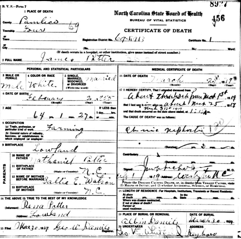 | 32 | 32 | Potter, James | w | m | 24 | m | Farmer | NC | NC | NC | Death Certificate | ||