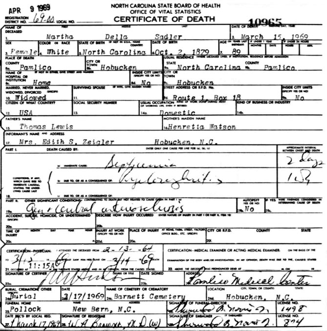 Born-Oct; married Frederick Augustus Sadler in Pamlico Co. on Jun 19, 1907;