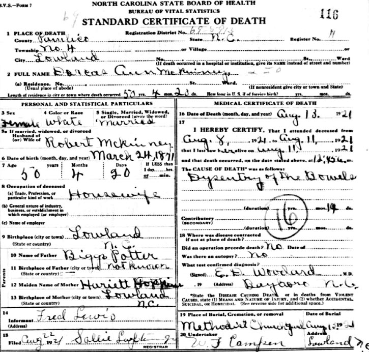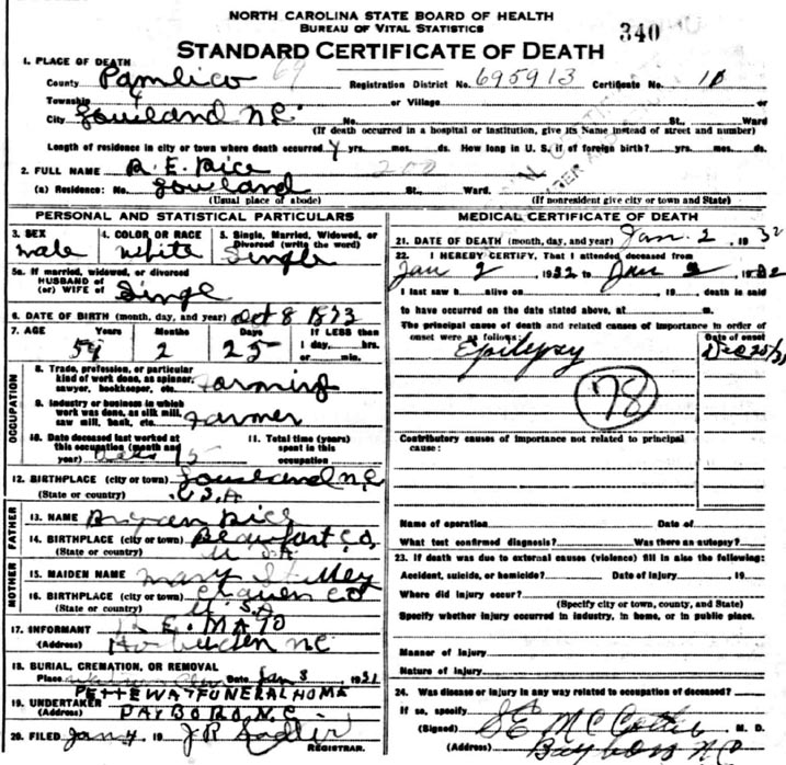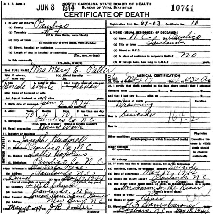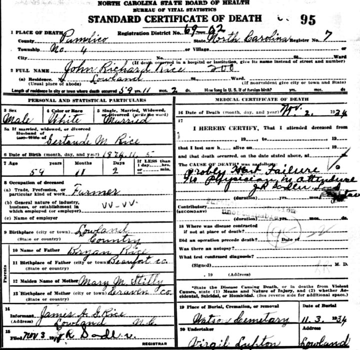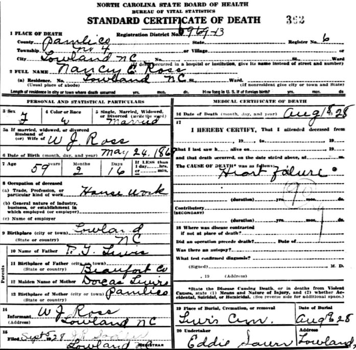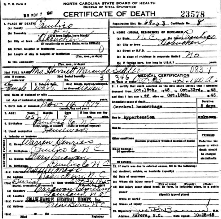 Born-Dec; married 1stHenry Andrew Spain; 2nd William Oliver Sadler in Pamlico Co. on July 7, 1919; Death Certificate |