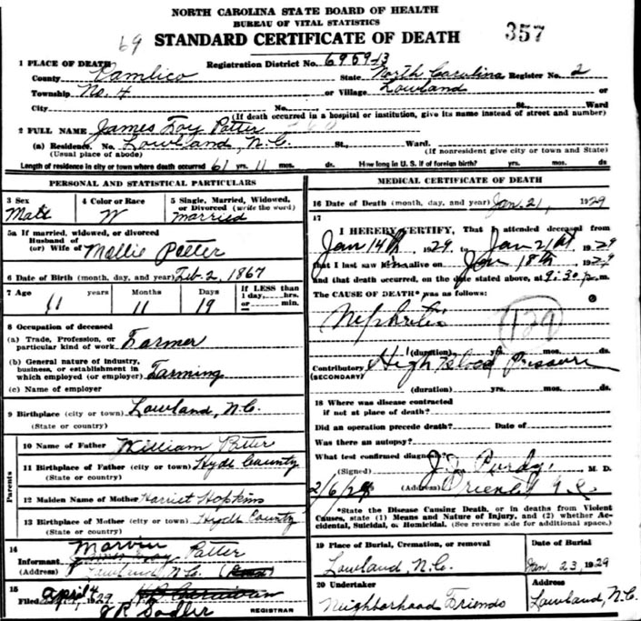 | Potter, James F. | w | m | 13 | grandson | s | Works on farm | NC | NC | NC | Death Certificate | |||