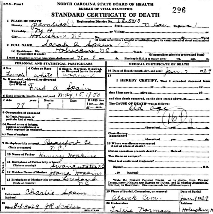 Sickness-Confined; d/o Henry H. Hopkins & Joanna Carawan; Married 1st Joseph Hudnell; 2nd Fredrick Augustas Spain in Pamlico Co. on Aug 1, 1886; Death Certificate |