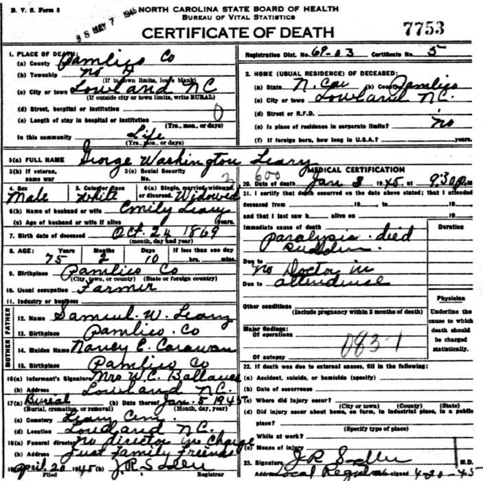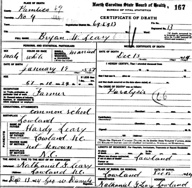 | Leary, Bryan W. | w | m | 22 | son | s | Works on farm | NC | NC | NC | Death Certificate | |||