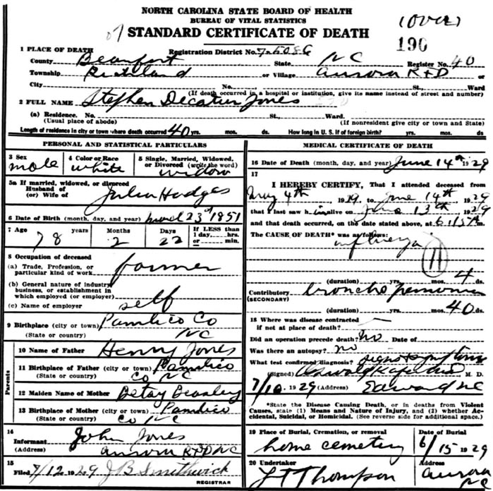 Born Feb 18, 1877, died June 27, 1968; married Mary James Bateman in Pamlico Co. on June 25, 1898 |