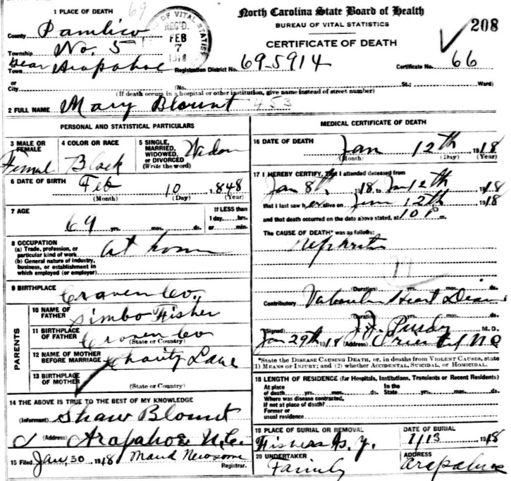 | Blunt, Mary A. | b | f | 30 | wife | m | Keeping house | no | NC | NC | NC | Death Certificate | ||