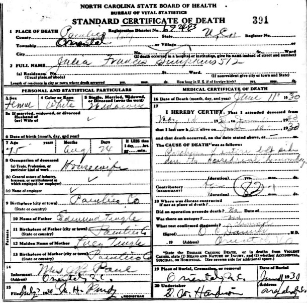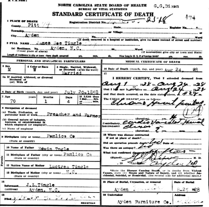 | Tingle, Julia F. | w | f | 24 | daughter | s | NC | NC | NC | Death Certificate | ||||
