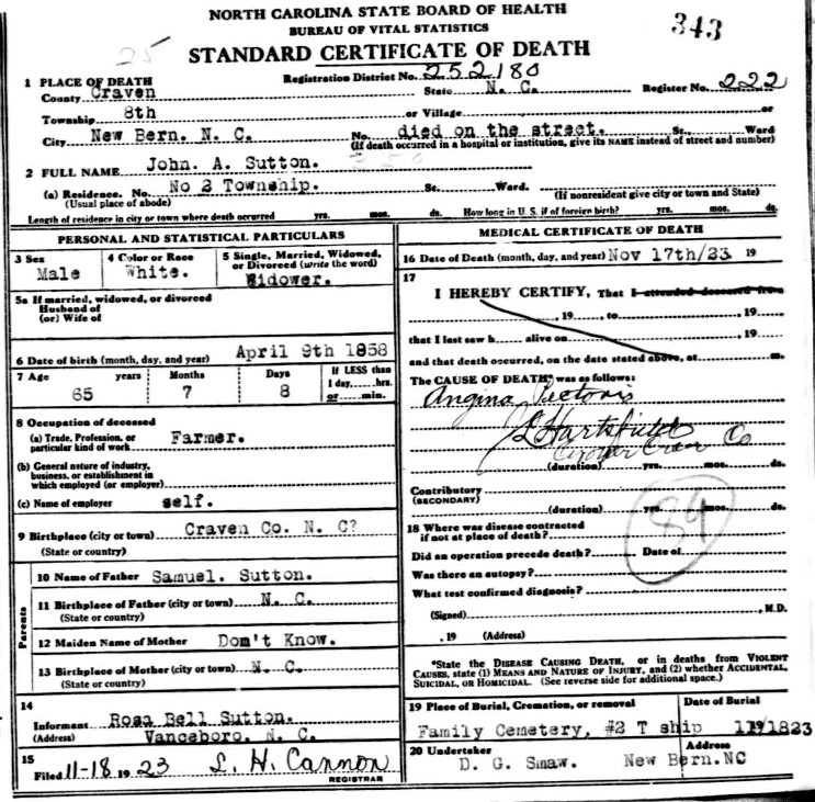 | Sutton, John A. | w | m | 22 | son | s | Works on farm | NC | NC | NC | Death Certificate | |||