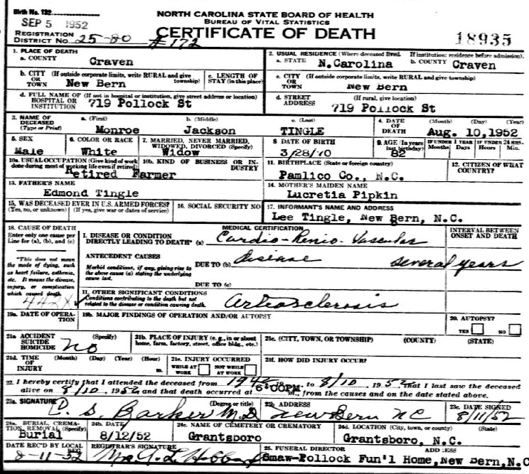 | Tingle, Monroe J. | w | m | 10 | son | s | Works on farm | no | NC | NC | NC | Death Certificate | ||