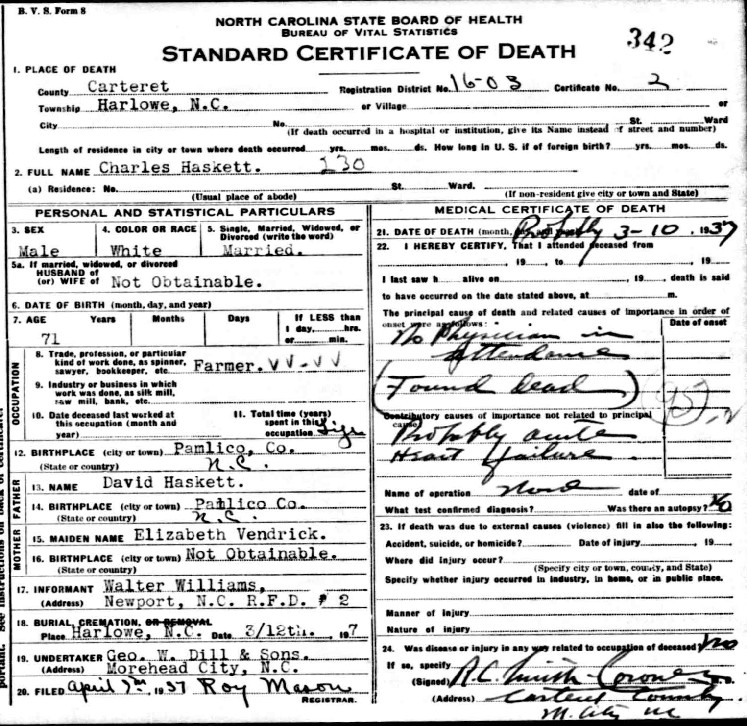 | Haskett, Charles H. | w | m | 15 | son | s | Works on farm | yes/no | NC | NC | NC | Attended school within the year; Death Certificate | ||