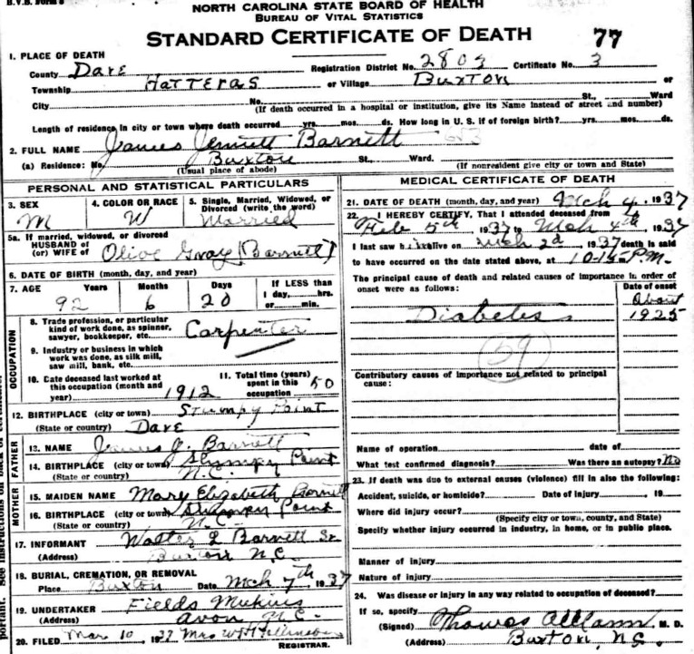 | 114 | 116 | Barnett, James J. | w | m | 35 | m | House carpenter | NC | NC | NC | Death Certificate | ||